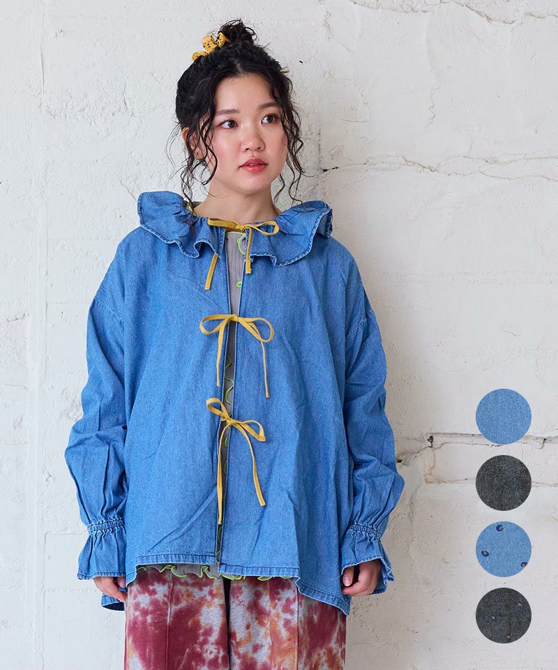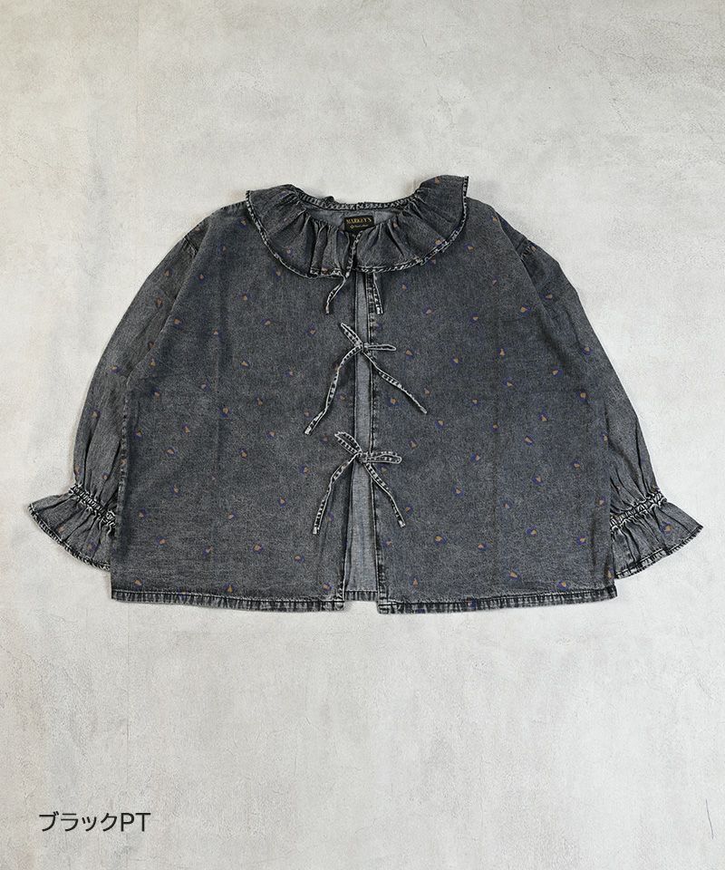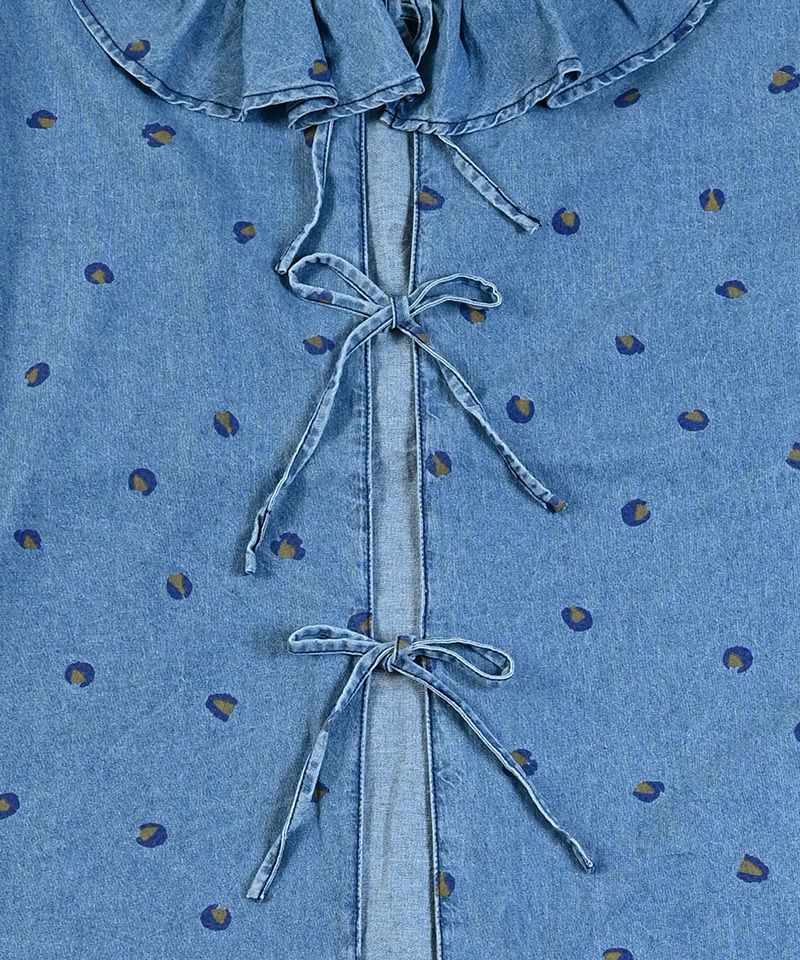デニム+レオパードプリントにフリルカラーがポイントのブラウス。