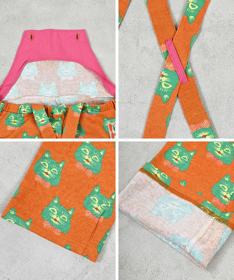 インパクトのある総柄プリントが目を引く、ミニ裏毛素材のサロペット。