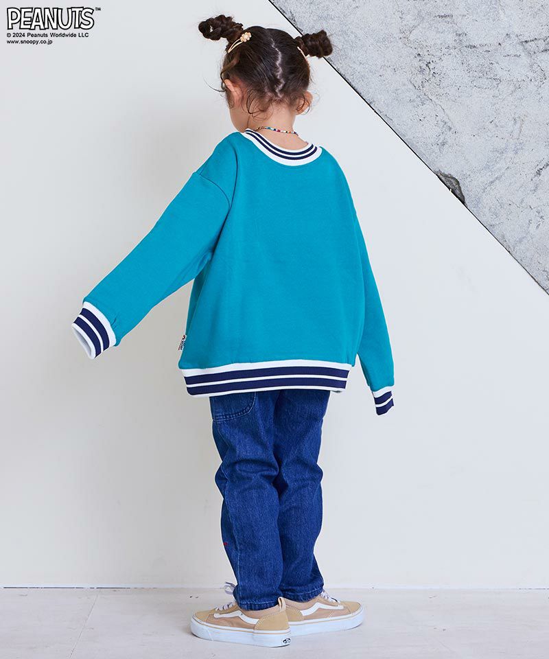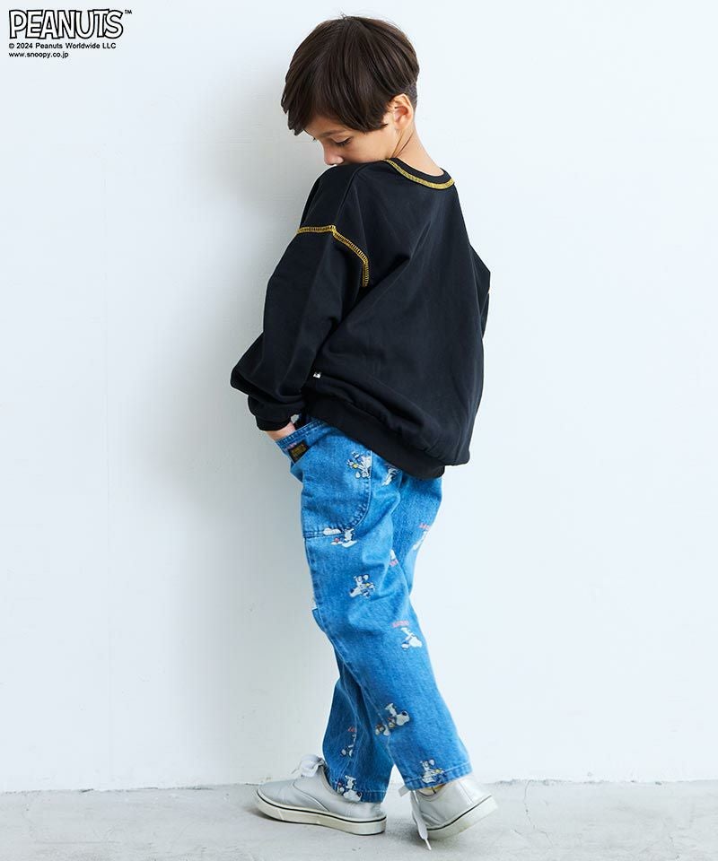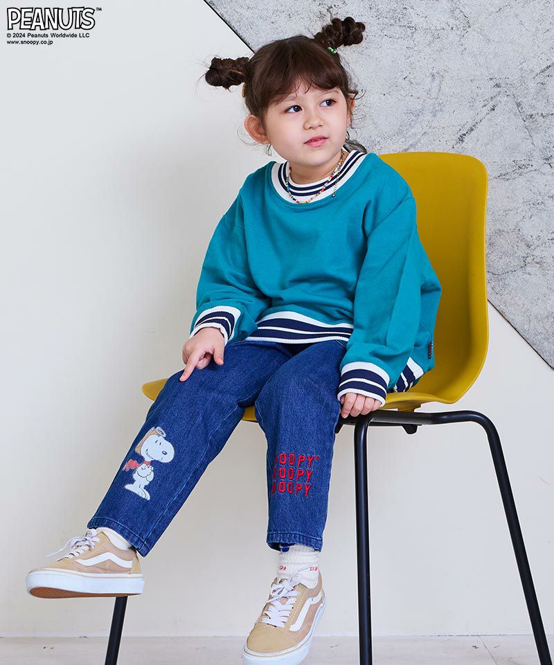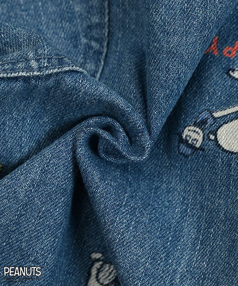 ライトブルーPTはパペットで遊ぶスヌーピーのプリントが全体に散りばめられておりネイビーは裾部分にスヌーピープリントとロゴ刺繡が施され、とっても可愛いデニムパンツ☆