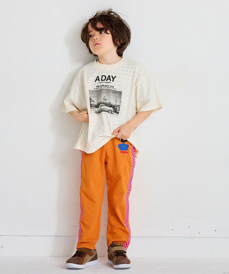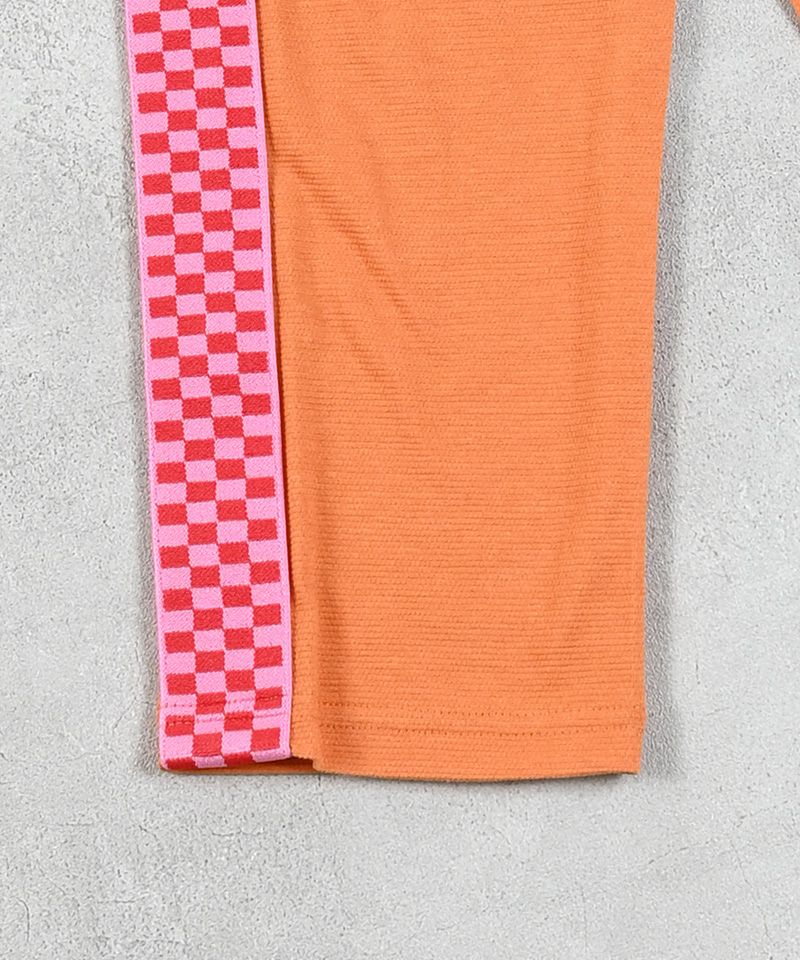 カラーとチェッカーラインが目を引くので、シンプルなトップスでコーデが完成します。