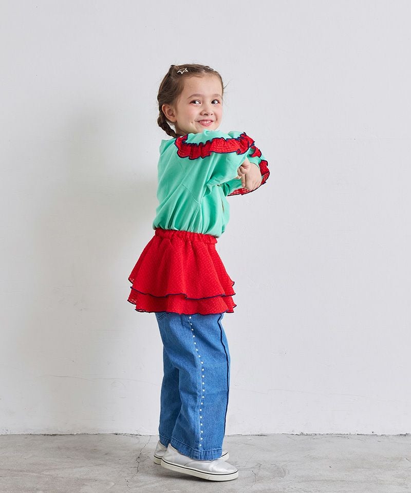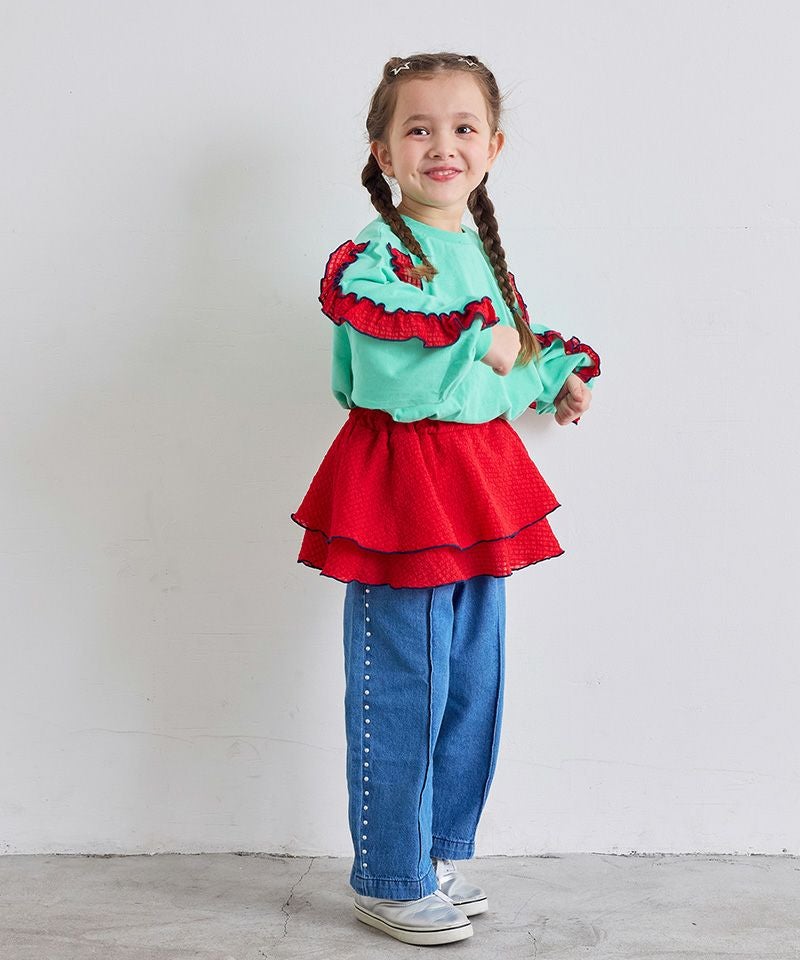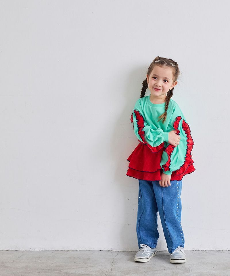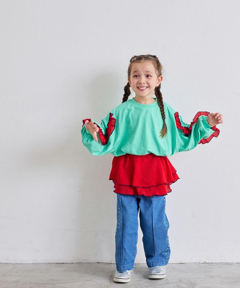 フレアーパンツや、チェックスカートなど、ガーリーなボトムスとの相性◎