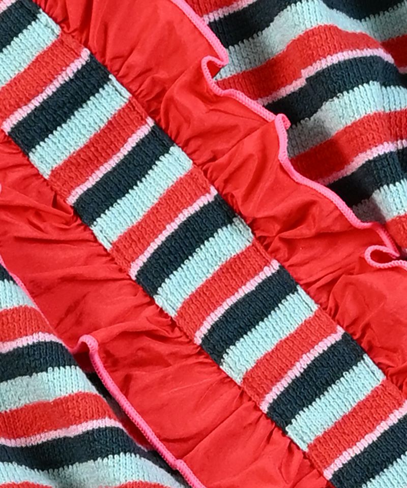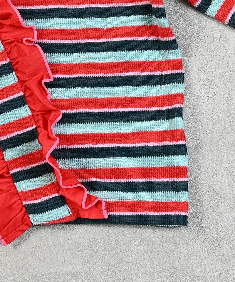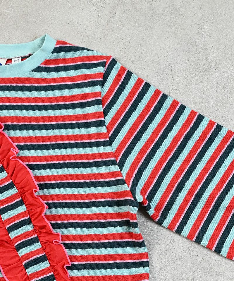 肩から斜めにあしらわれた大胆なフリルが目を引きます。