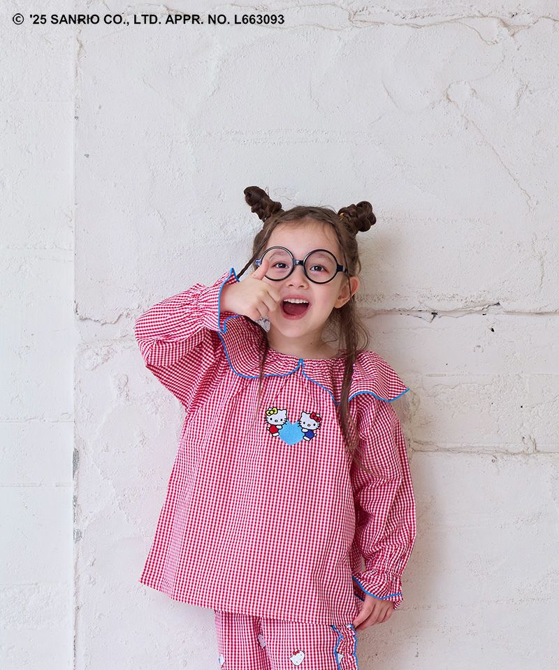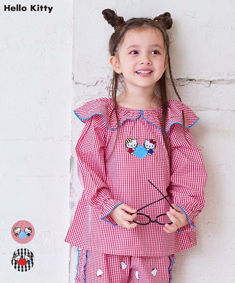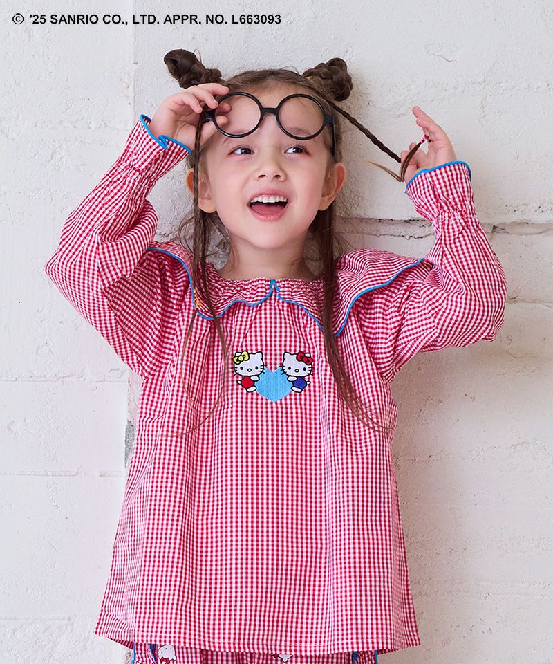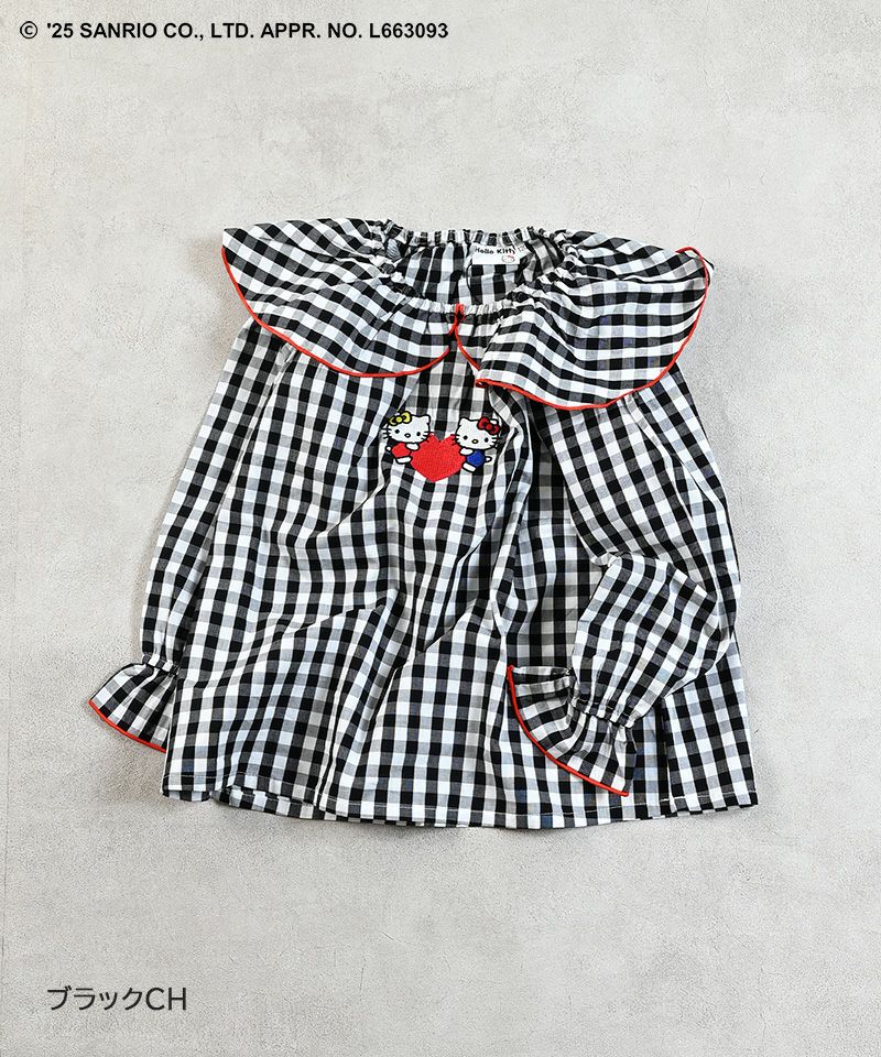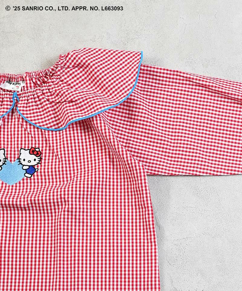 キャンディスリーブがふんわりとしたシルエットを演出し、フロントには仲良しのハローキティとハローミミィの刺繍をあしらった特別感のある一枚です。