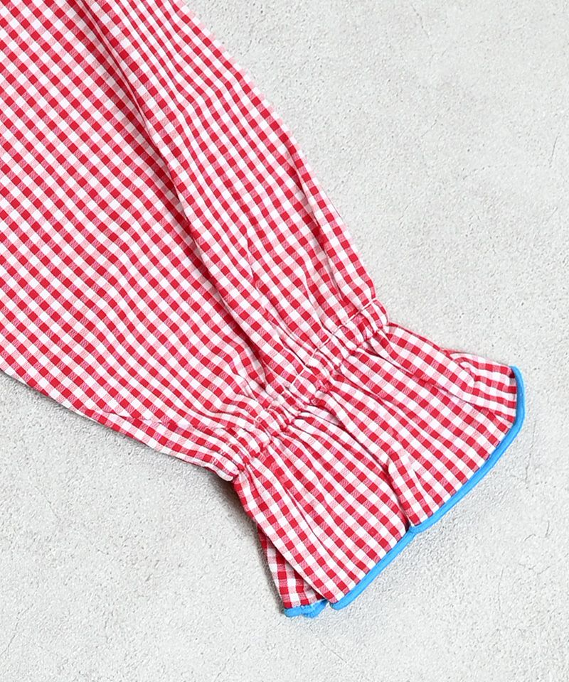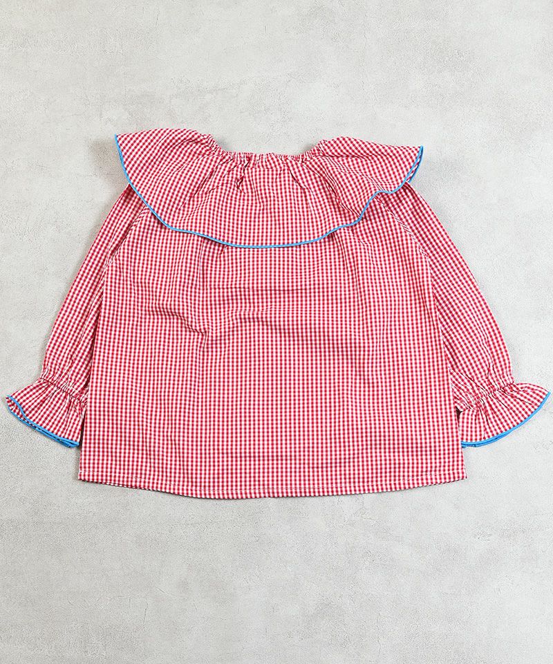 フリル襟に配色パイピングを効かせた、クラシカルで可愛らしいデザイン。