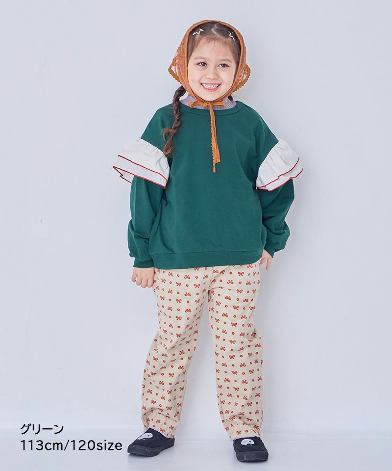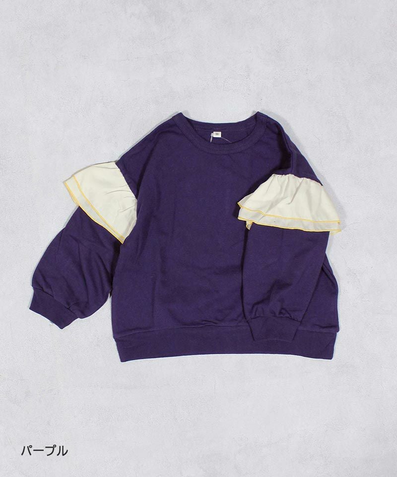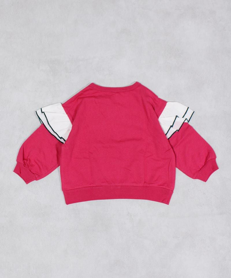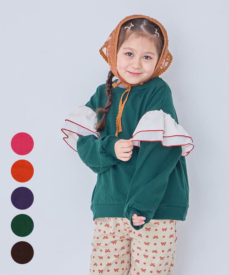 身頃は柔らかな裏毛素材、袖には布帛(ふはく)生地のフリルが印象的なデザイン。