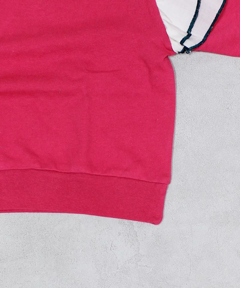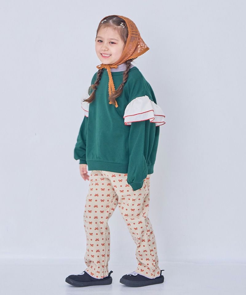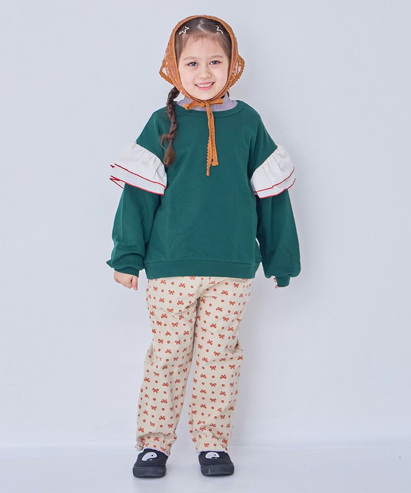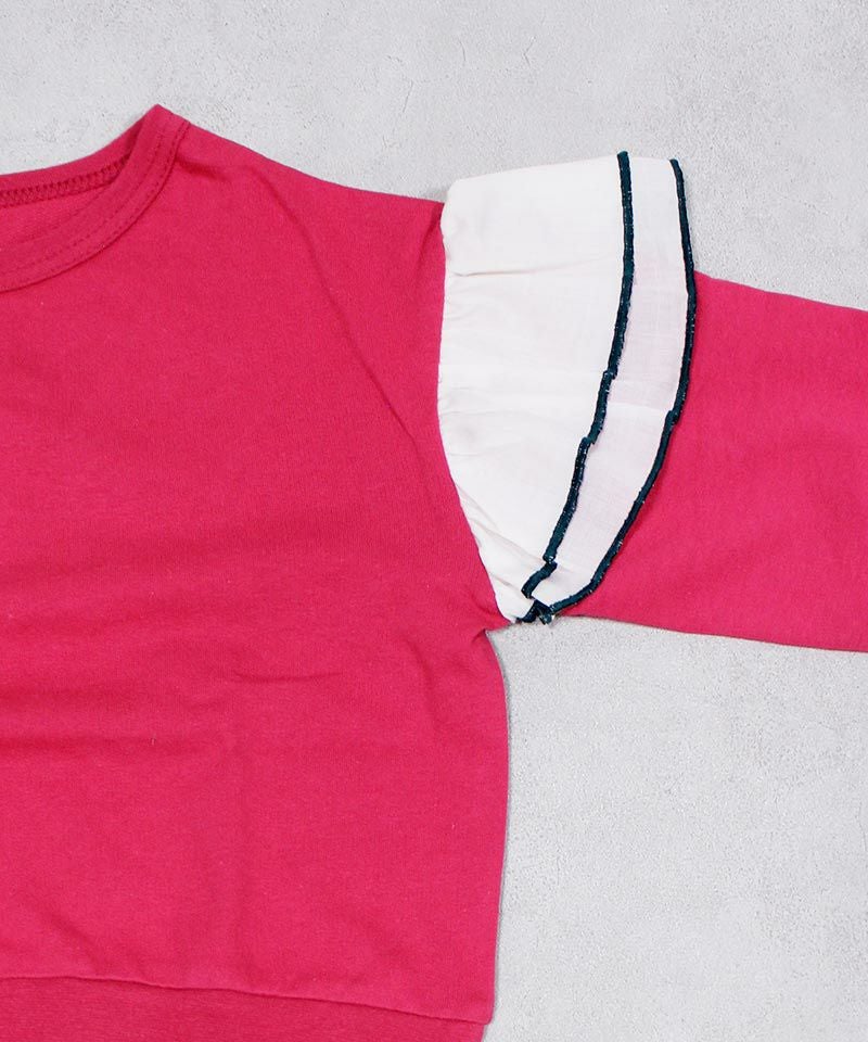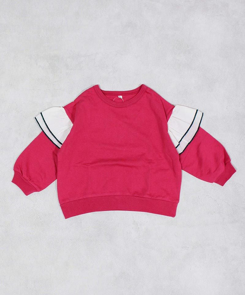 身頃は柔らかな裏毛素材、袖には布帛(ふはく)生地のフリルが印象的なデザイン。