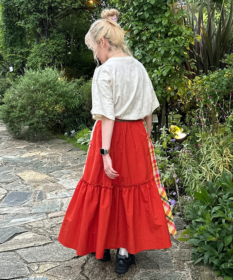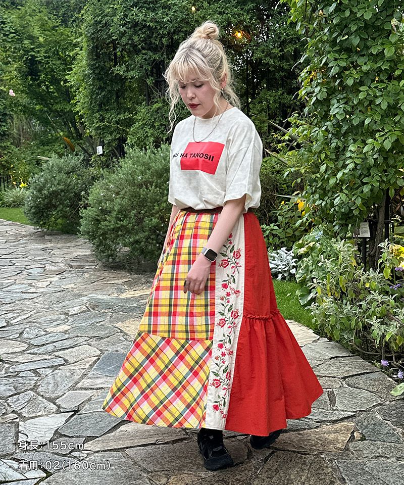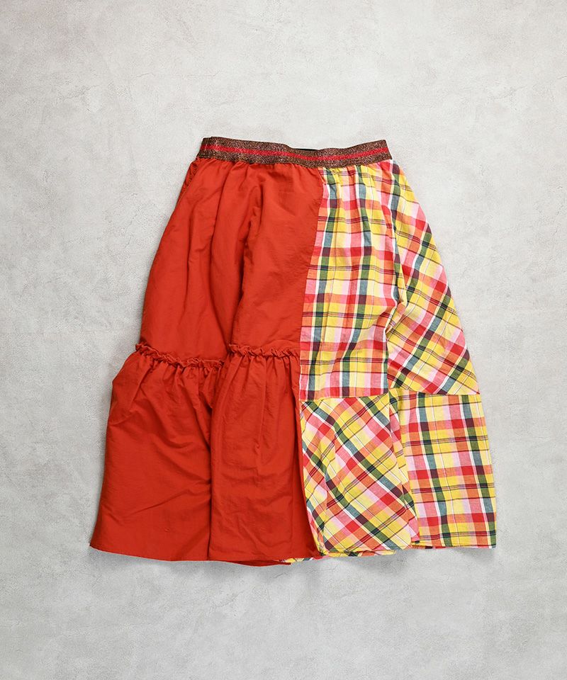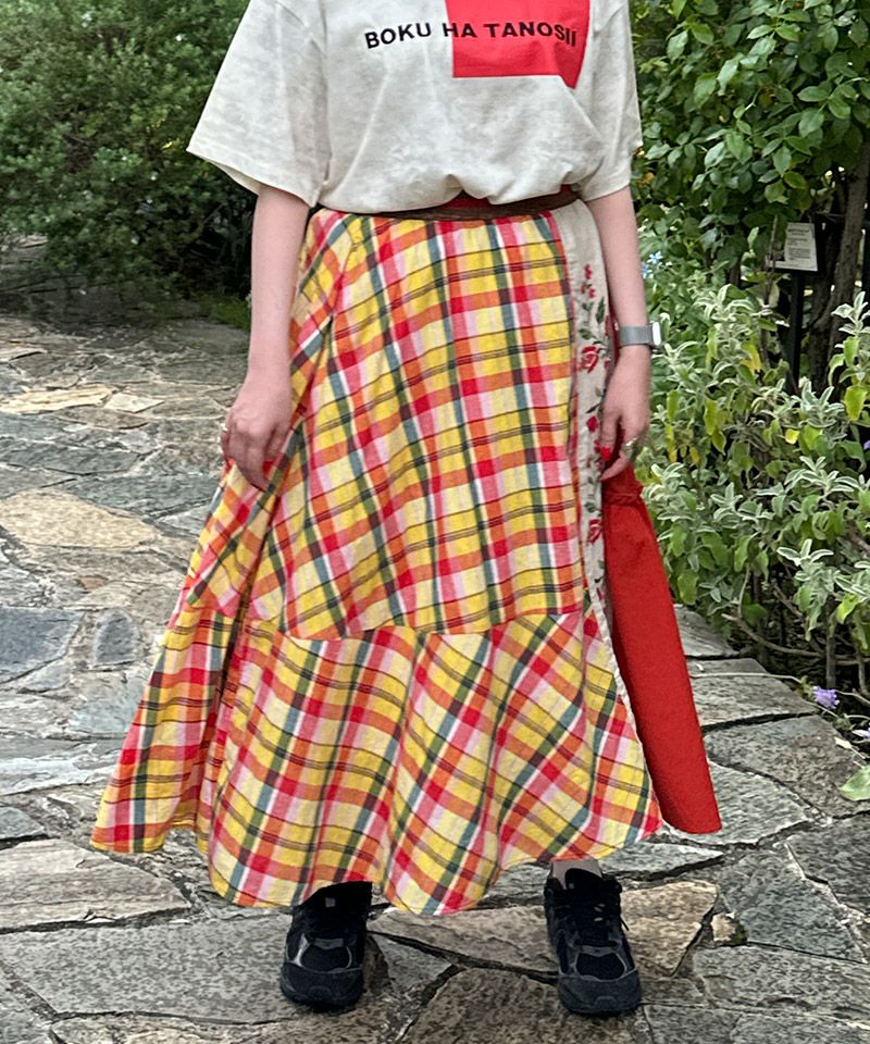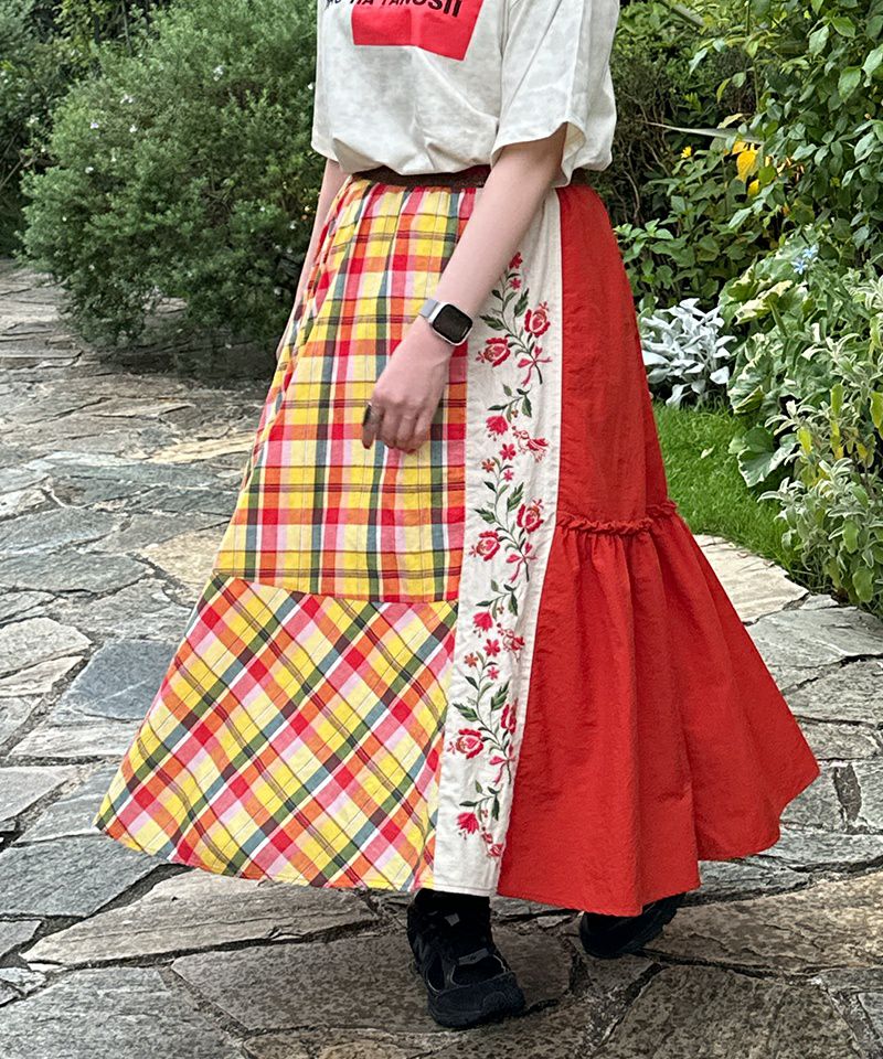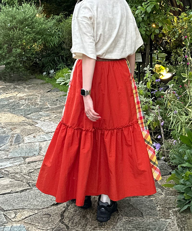 左右で異なる素材とフレアな分量感で、どこから見ても1枚で様になる存在感のあるデザインで、シンプルなTシャツコーデでも手抜きに見えないオシャレ度アップスカートです。