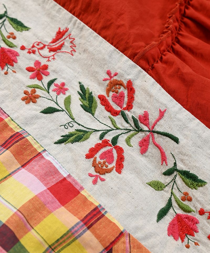 ナチュラルなしぼ感のある素材に刺繍を施し、プレッピーな夏の定番マドラスチェックで切り替えて夏の日差しに映える鮮やかなカラーリングでプレイフルなムードに仕上げました。