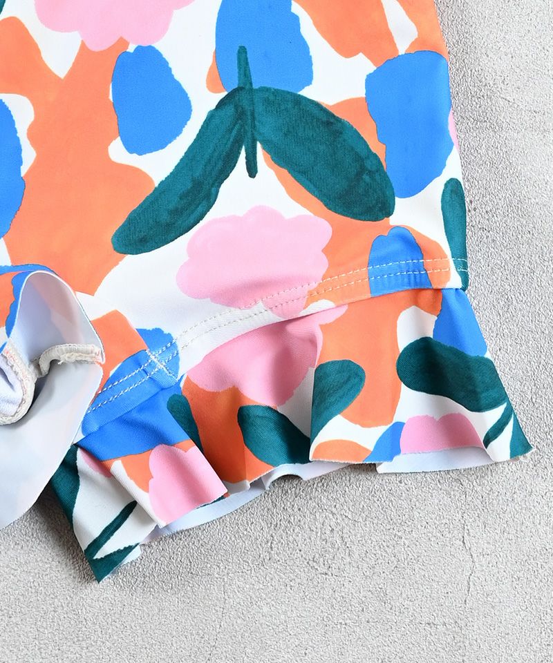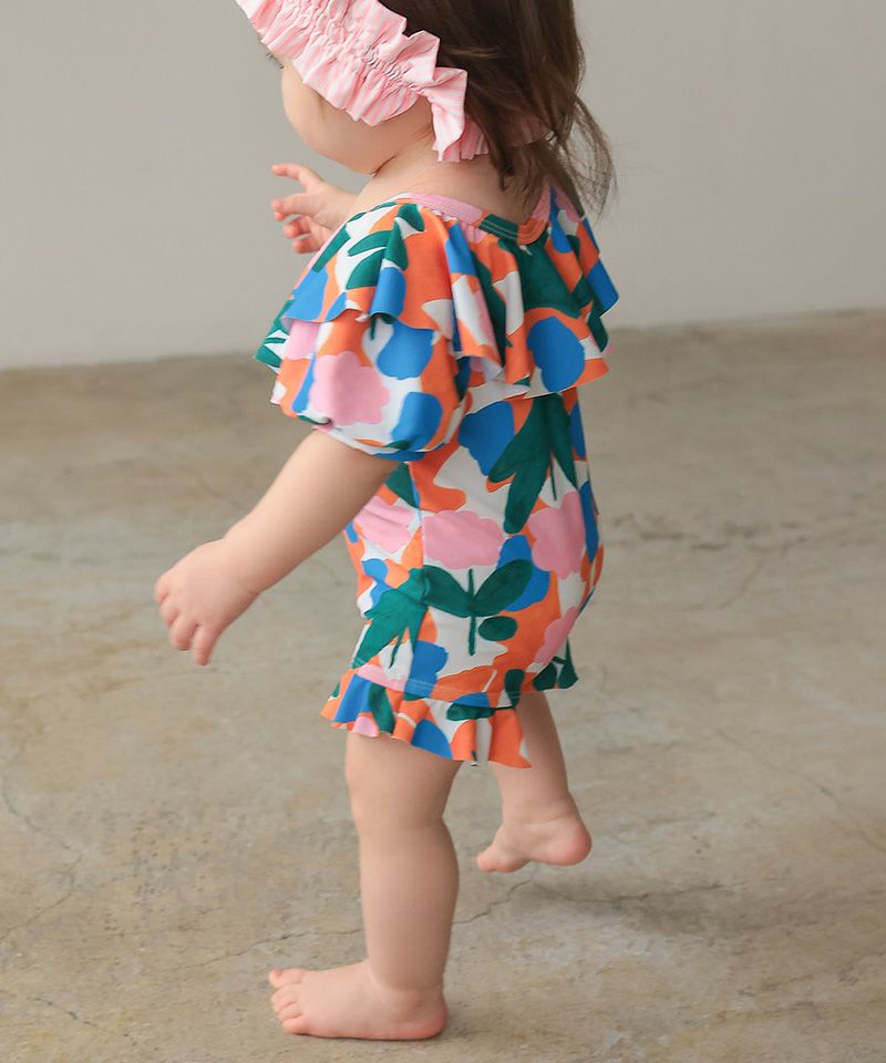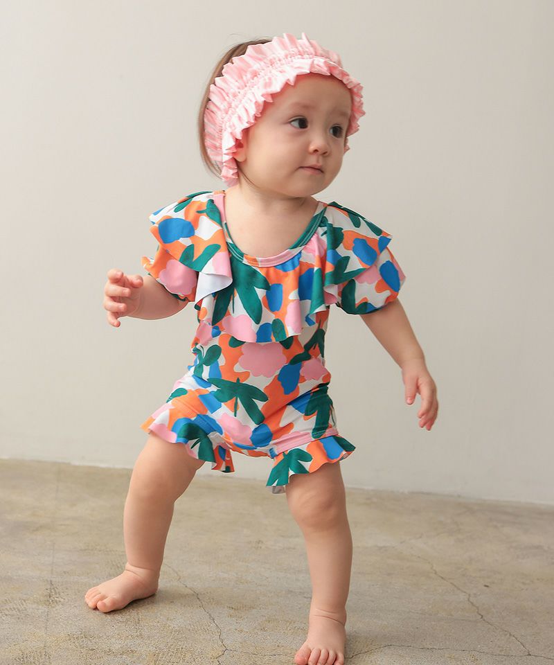 ベビーの水遊びに、大きなフリル衿やパフスリーブが可愛いオールインワン水着。