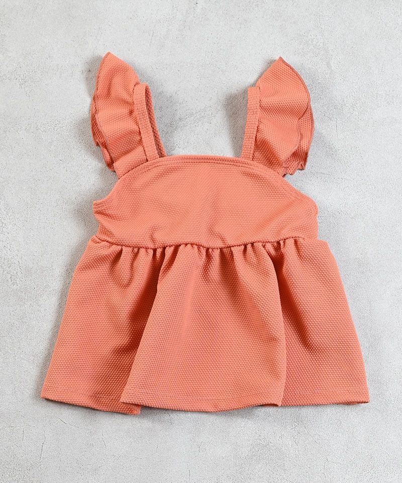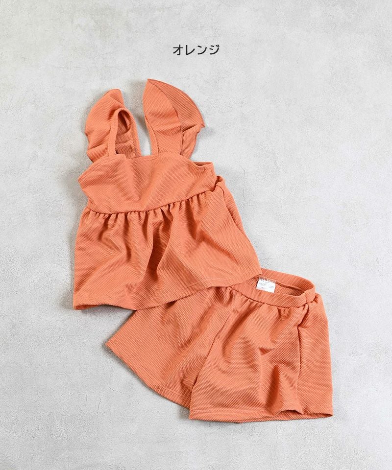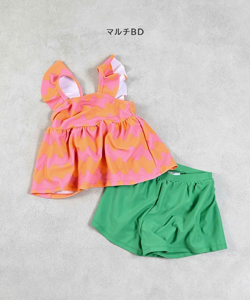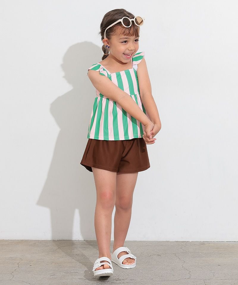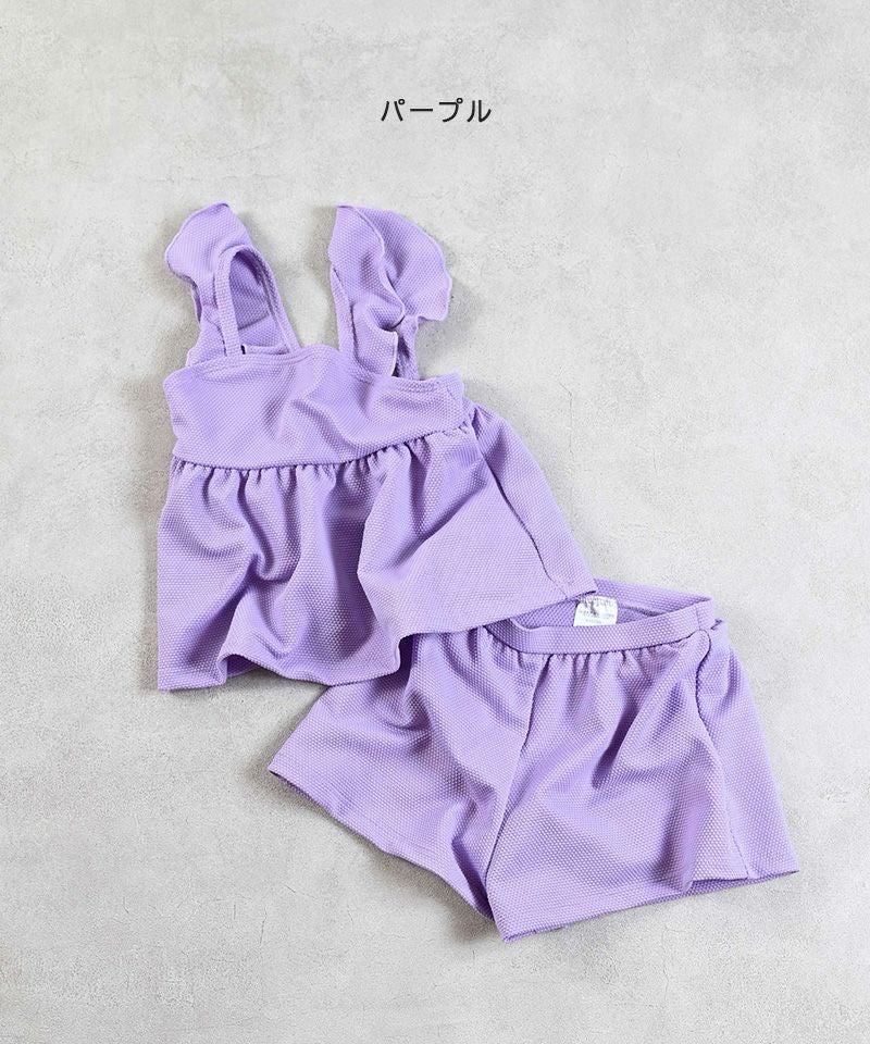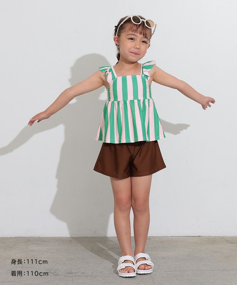 フレアをあしらった肩紐のお腹が隠れるトップスに、キュロットパンツを合わせたセットアップ水着。