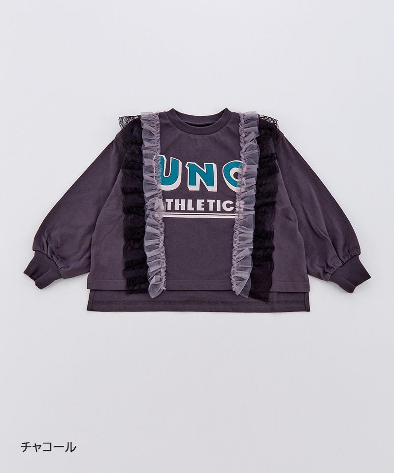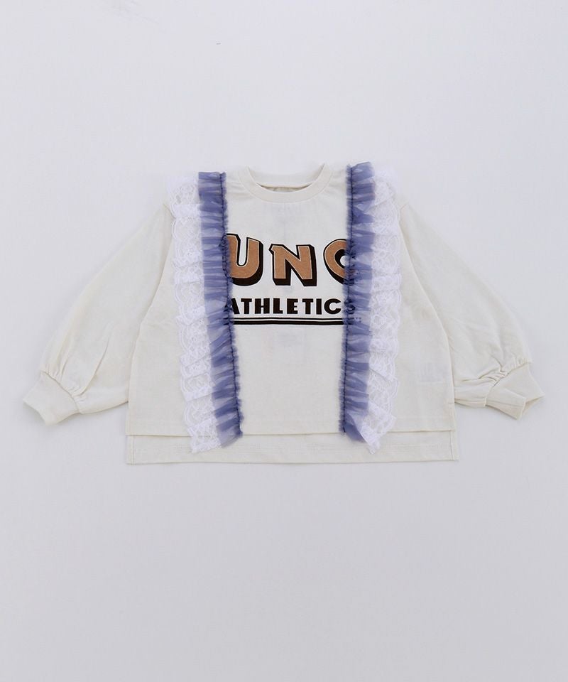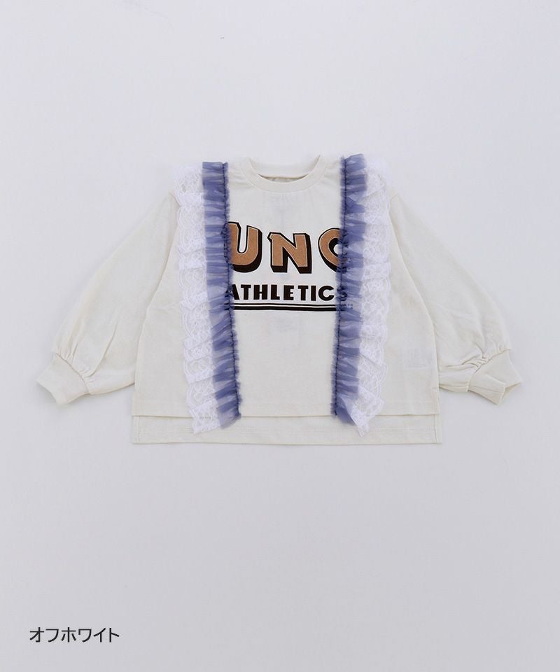 フロントのプリントにレースをリメイク風に組み合わせた個性的なデザイン。