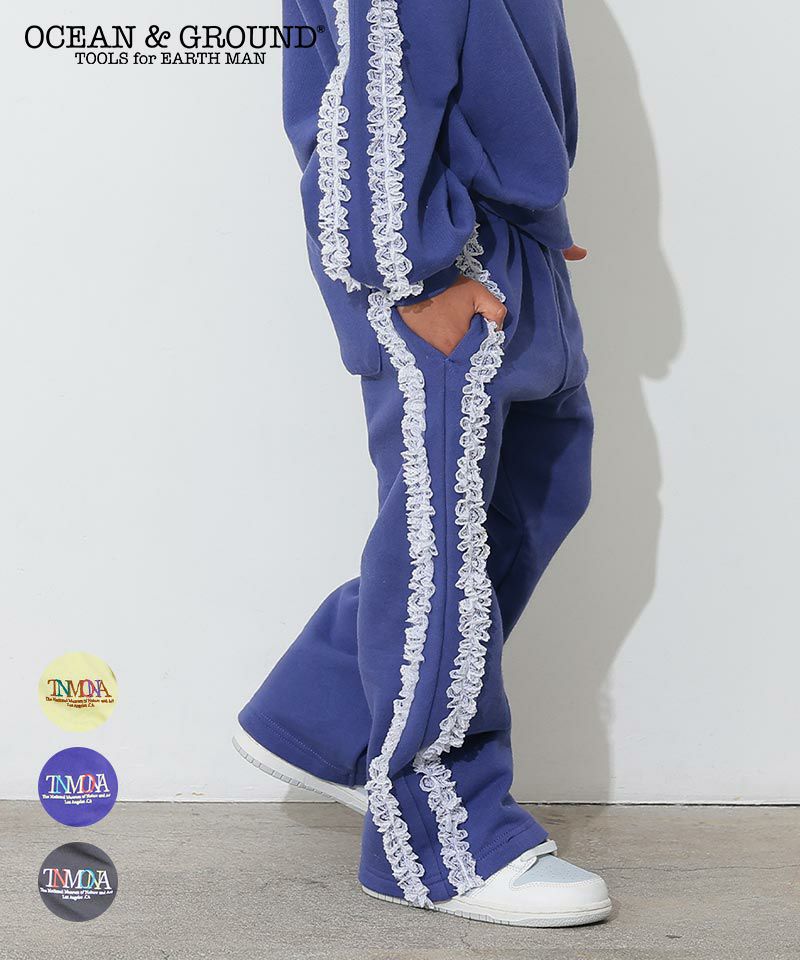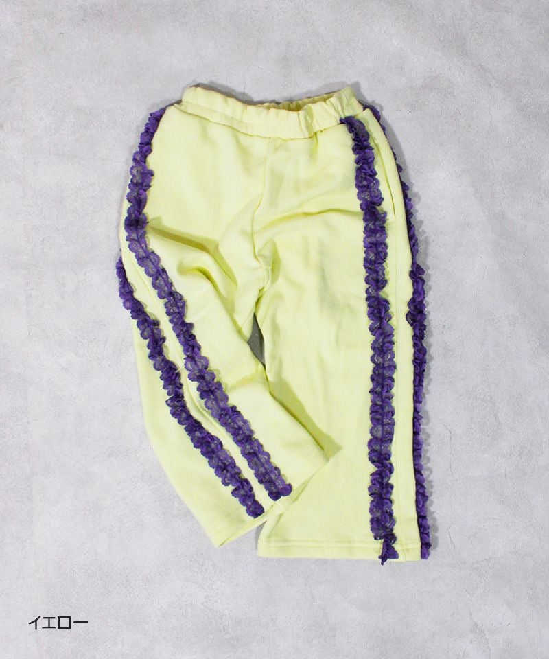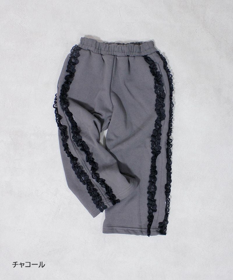 サイドラインにフリルレースをあしらった、ガーリーなスウェットパンツ。