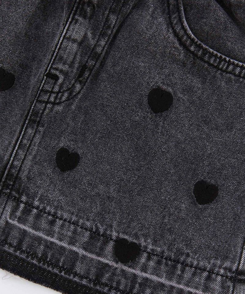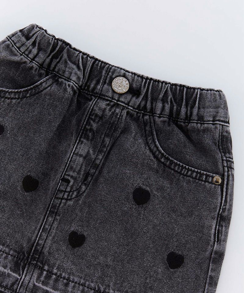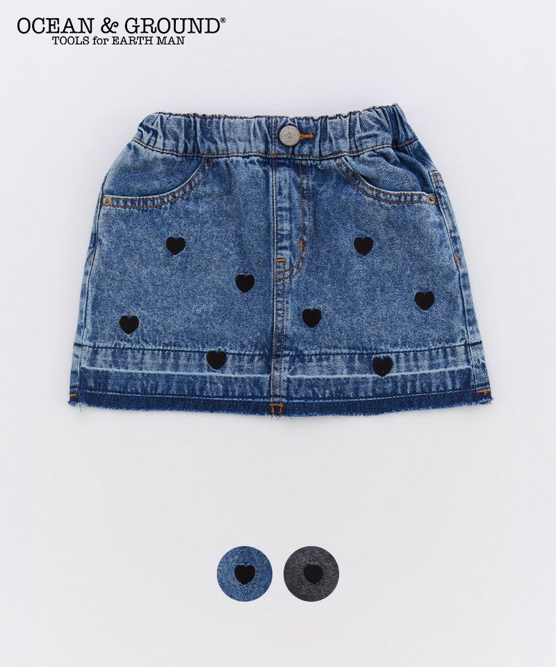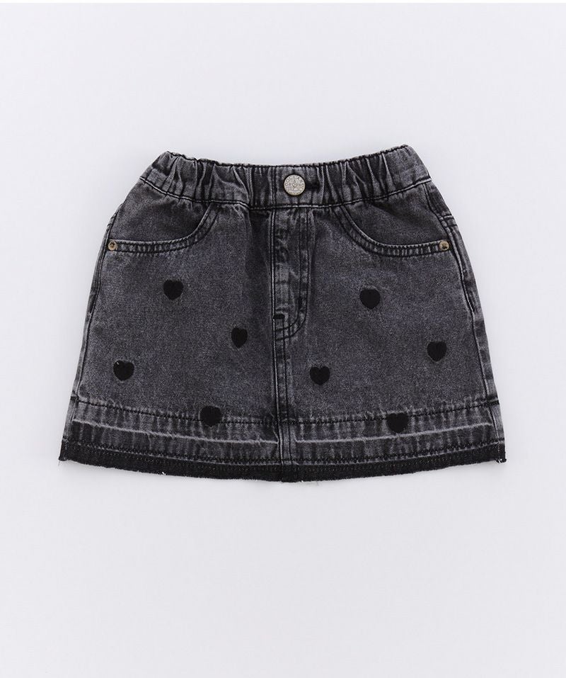 ベーシックなデニムミニスカートに、小さなハート刺繍をちりばめて可愛らしさを演出。