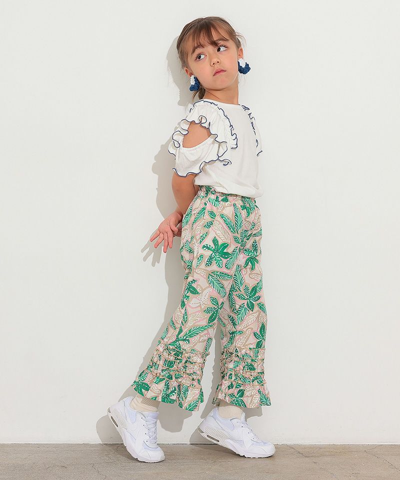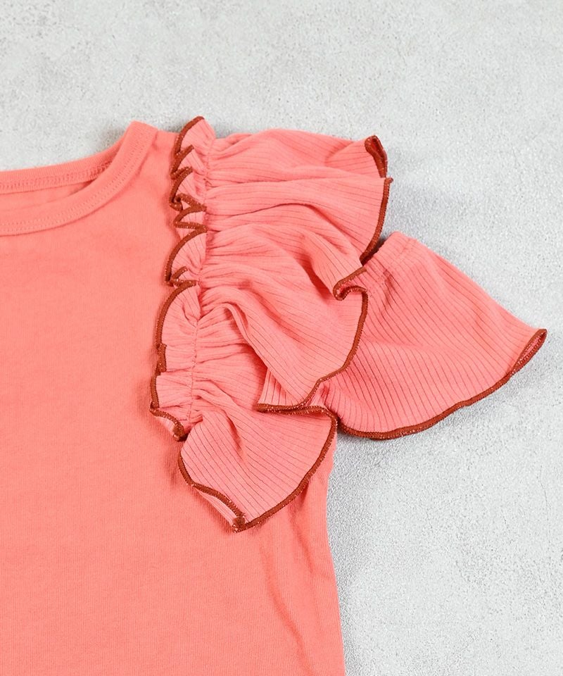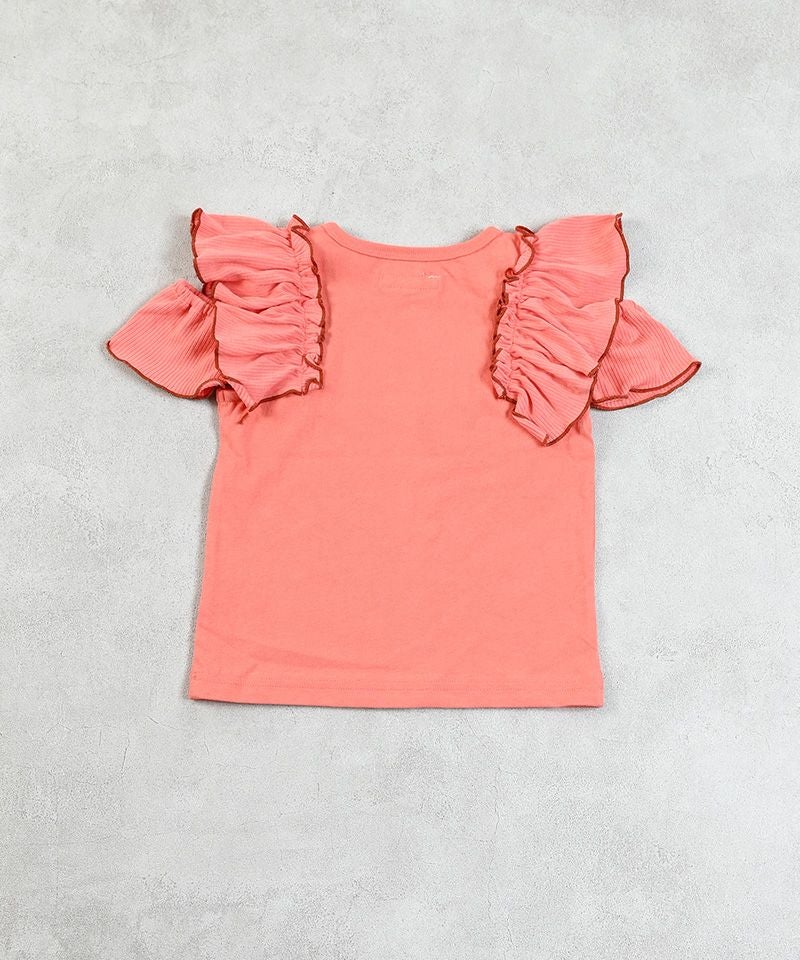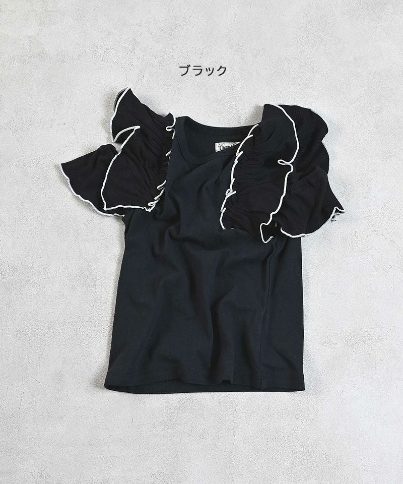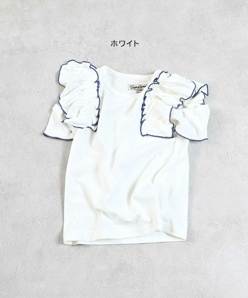 ボリュームフリルを施したガーリーデザインTシャツを、トレンドのオープンアームデザインに。