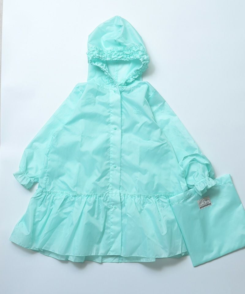 フードまわりと裾にフリルをあしらった、女の子らしいレインコートです。