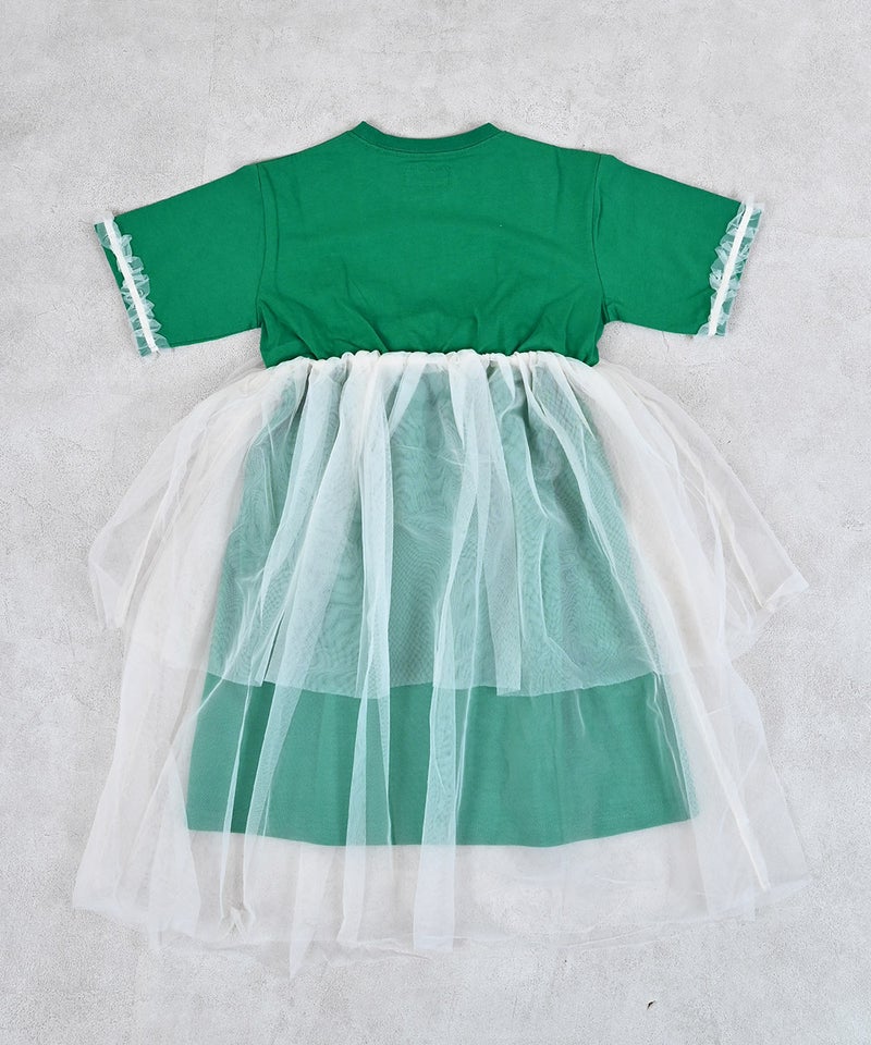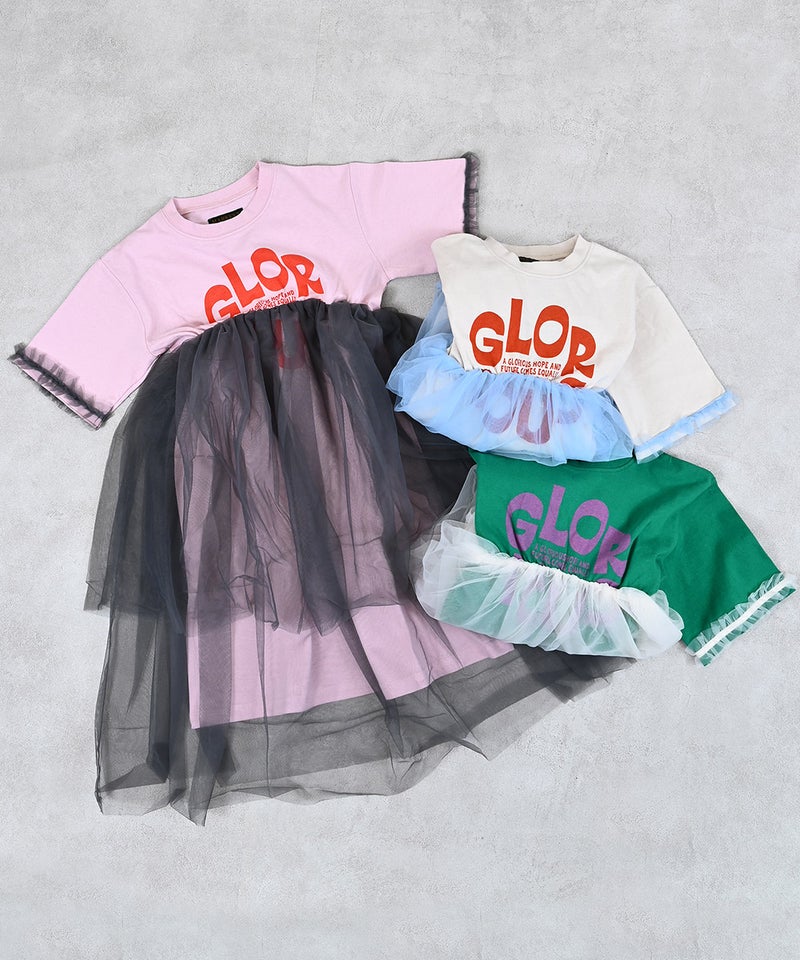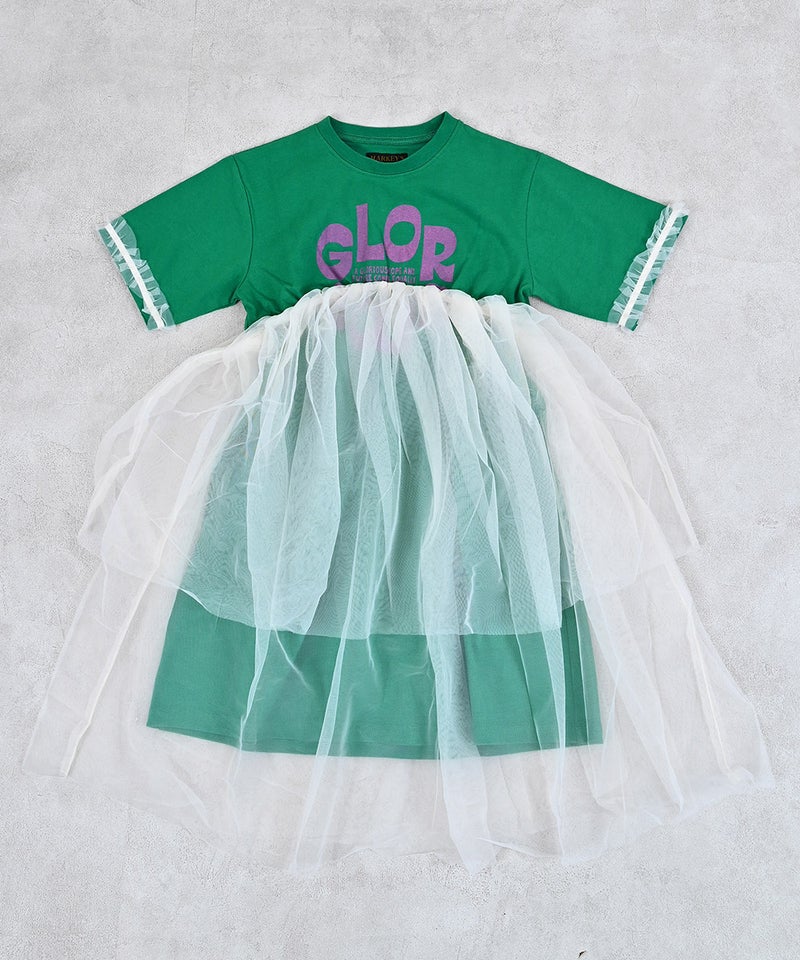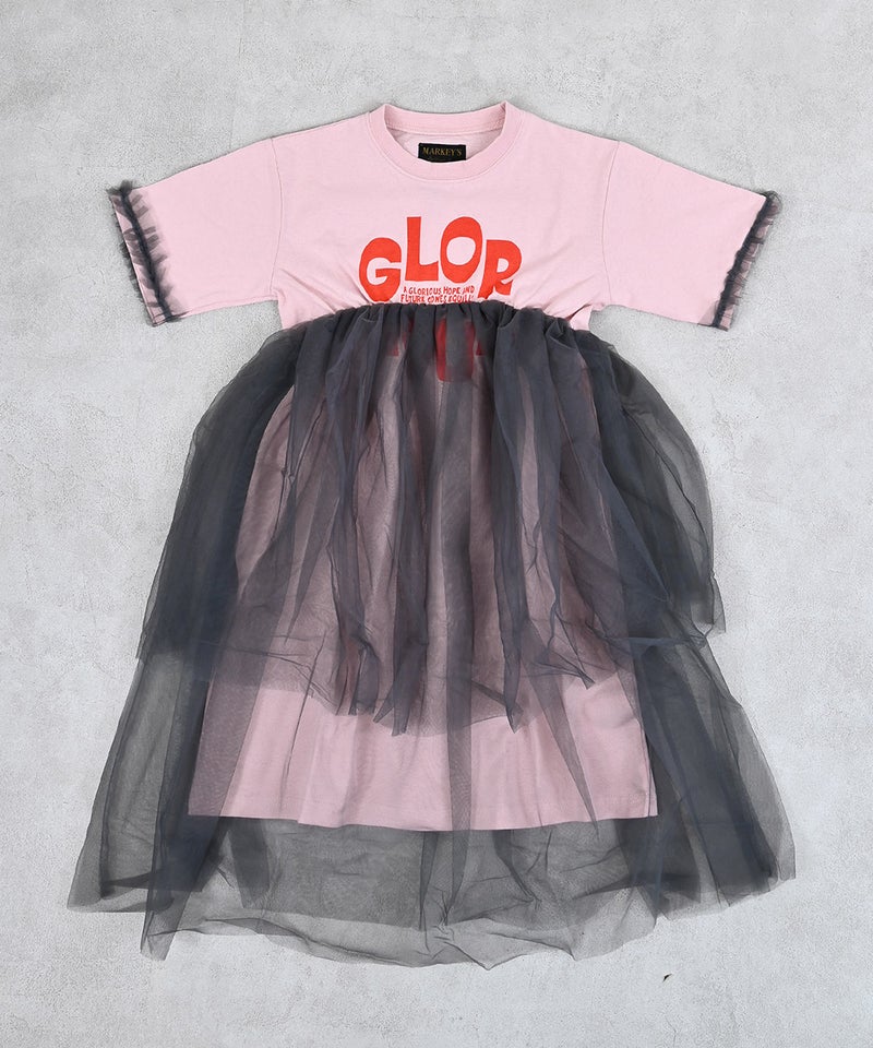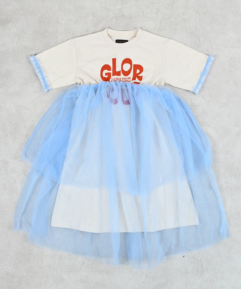 ロゴプリントワンピースにチュールスカートを重ねた、1枚でコーデが完成するドッキングデザインです。