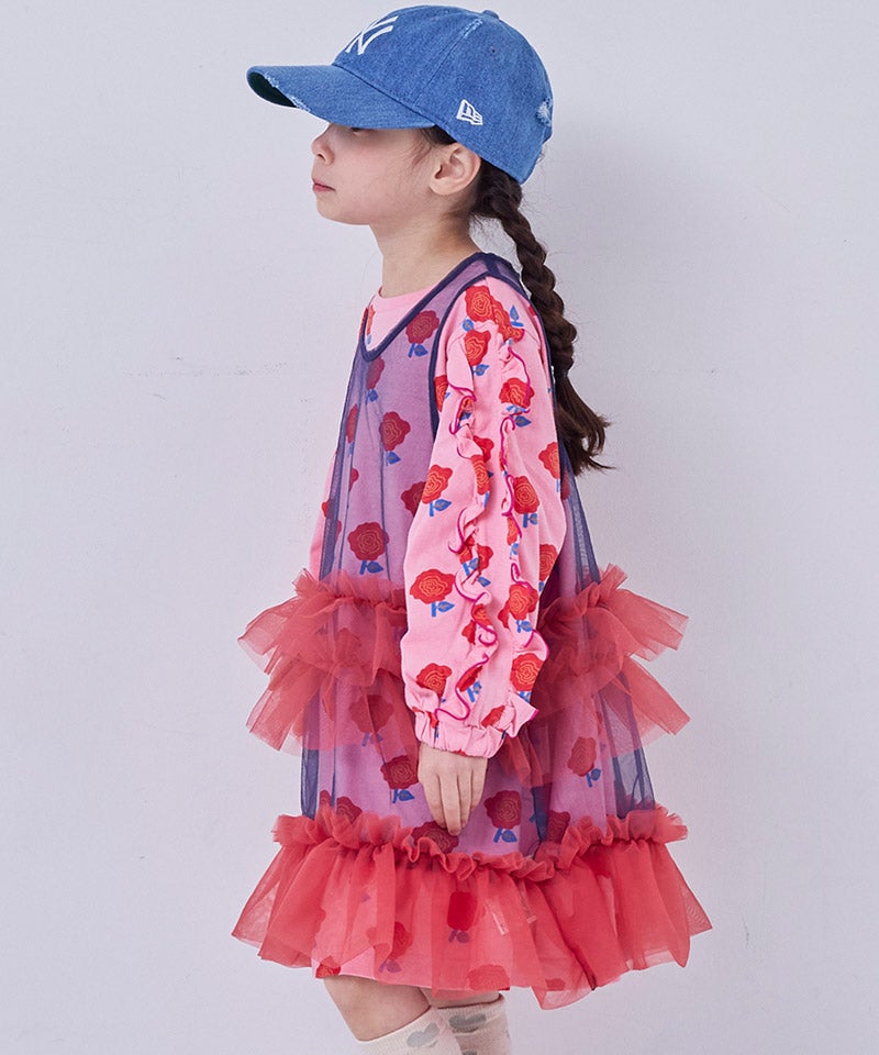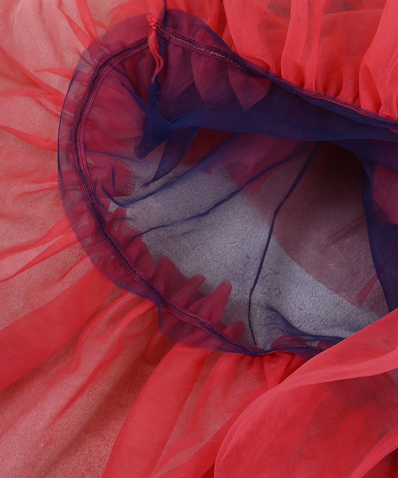 透け感のあるチュール素材にバイカラー配色を効かせたワンピースです。