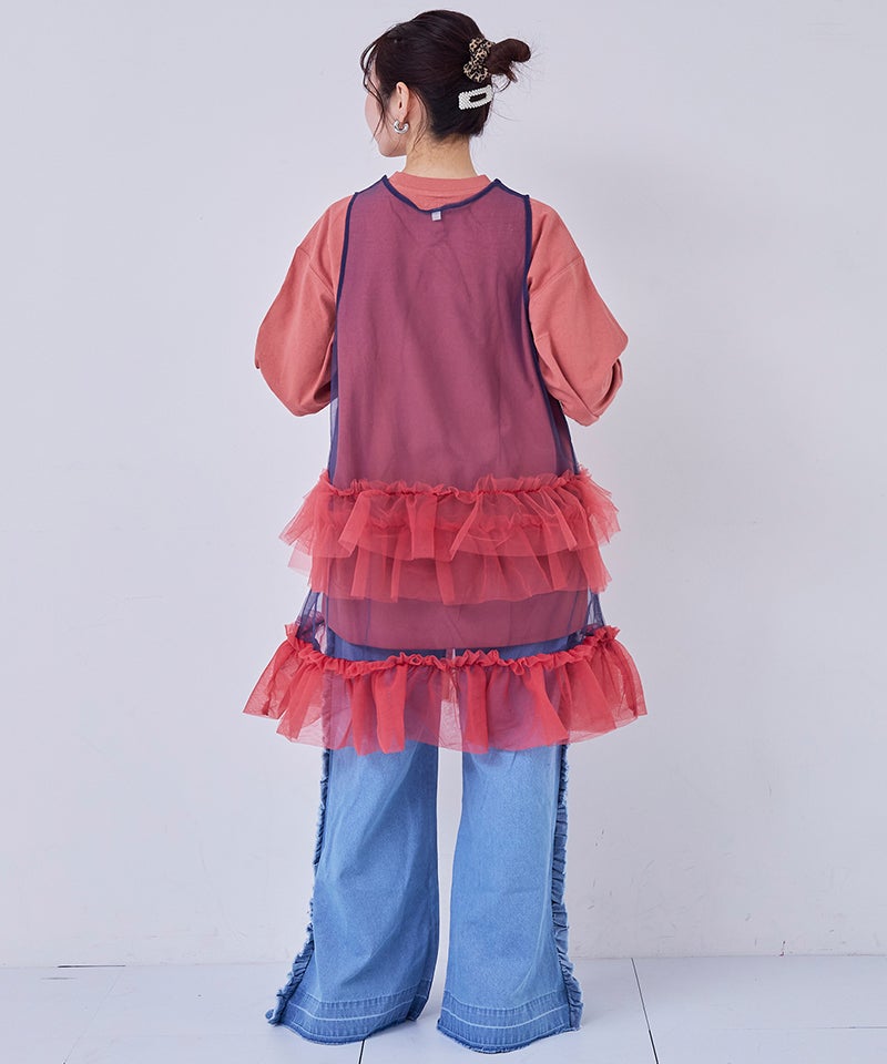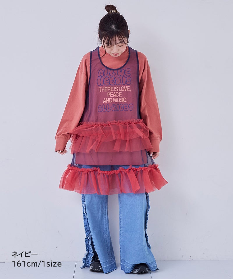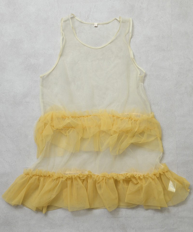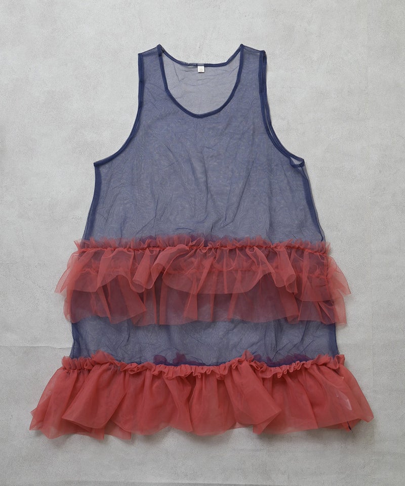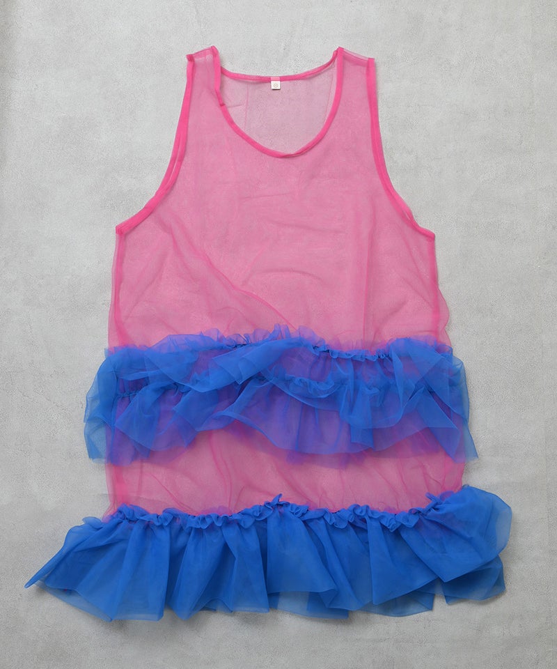 透け感のあるチュール素材にバイカラー配色を効かせたワンピースです。