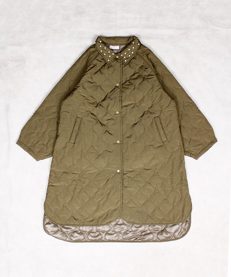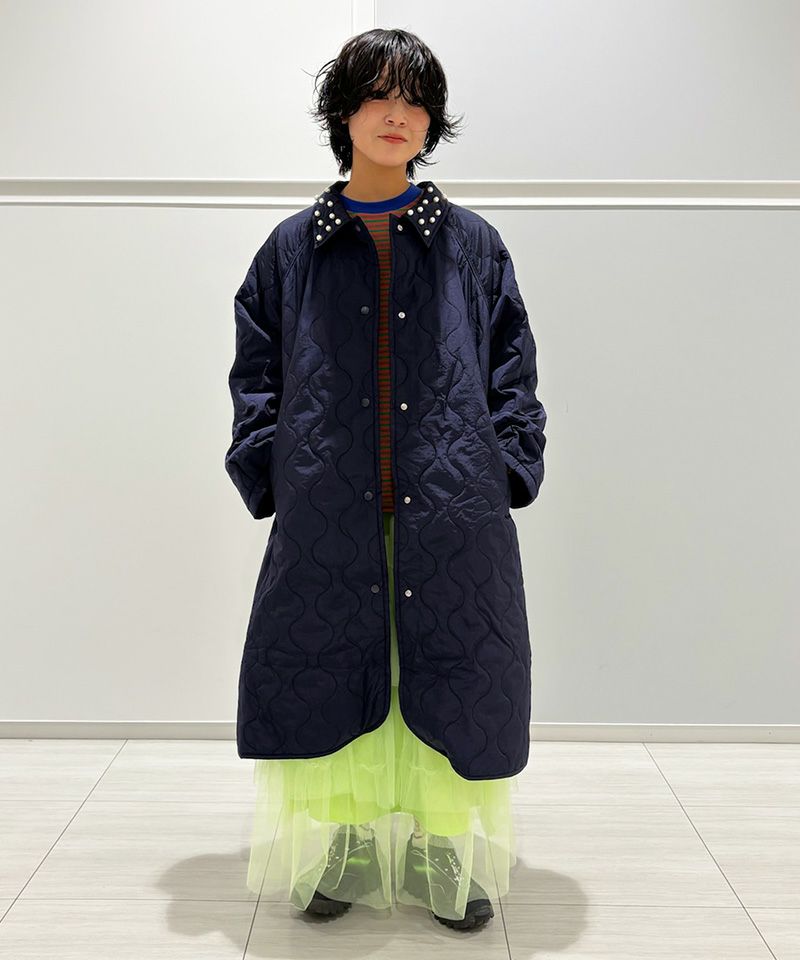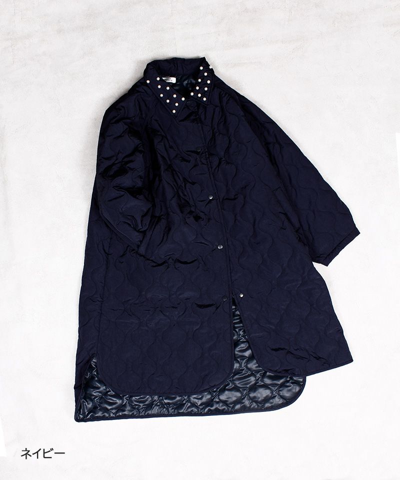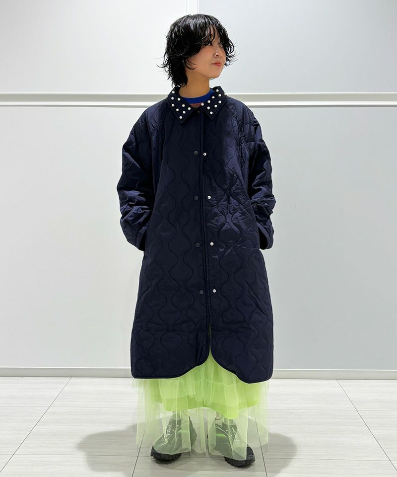 ふっくらとしたキルトに、パール調のポイントを添えた大人可愛いロングコート。