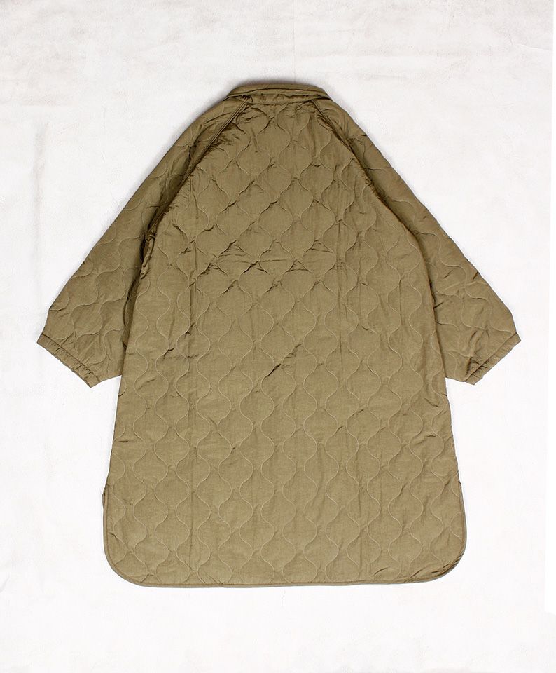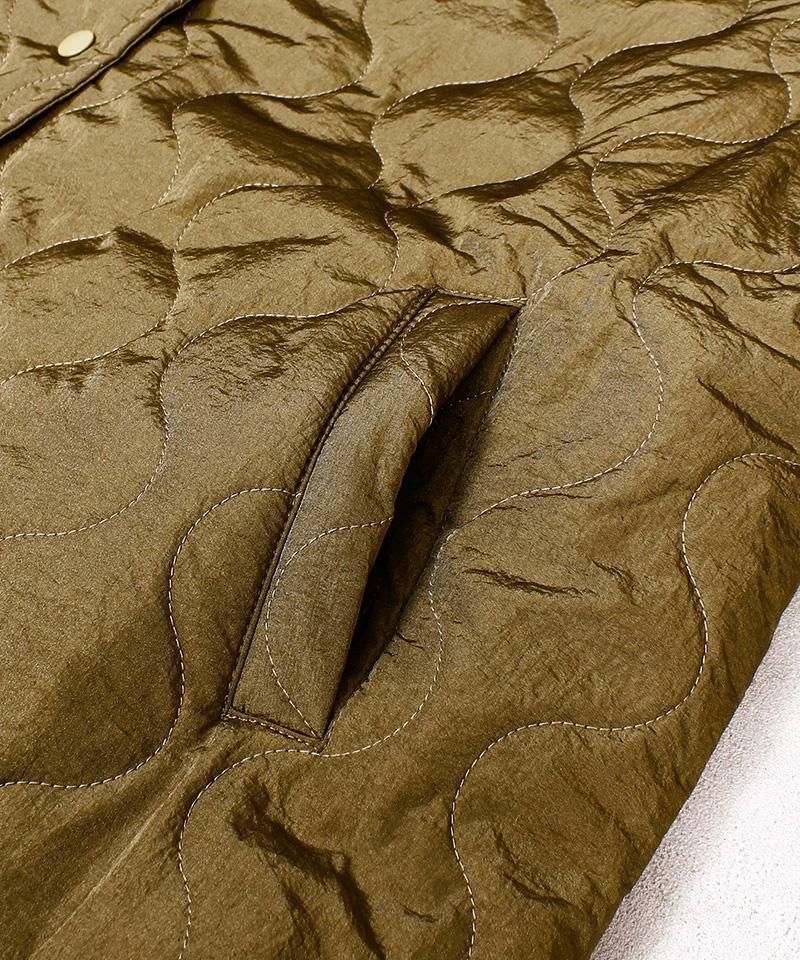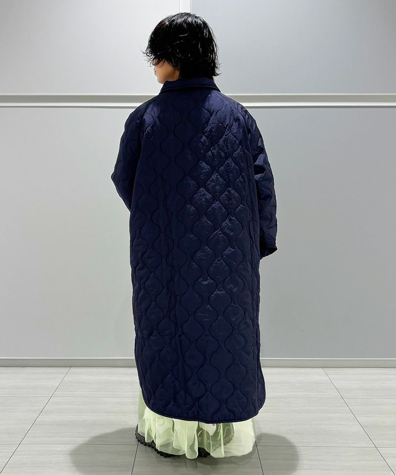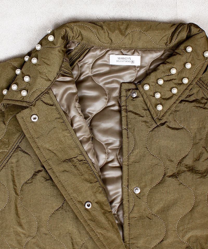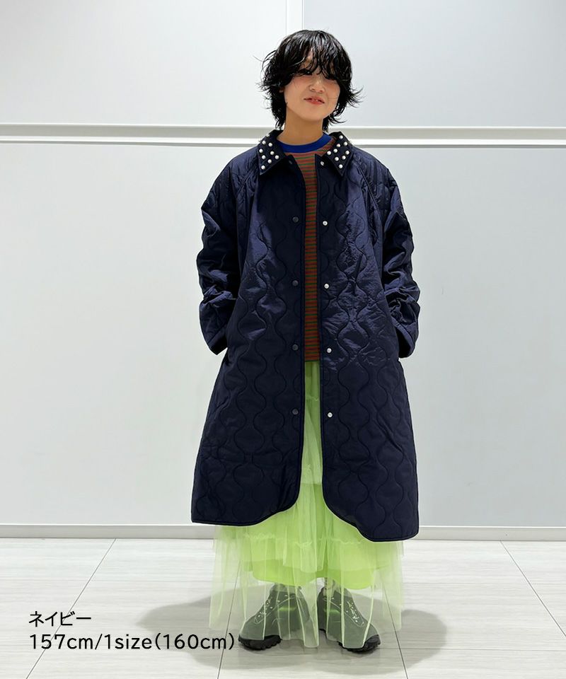 ふっくらとしたキルトに、パール調のポイントを添えた大人可愛いロングコート。