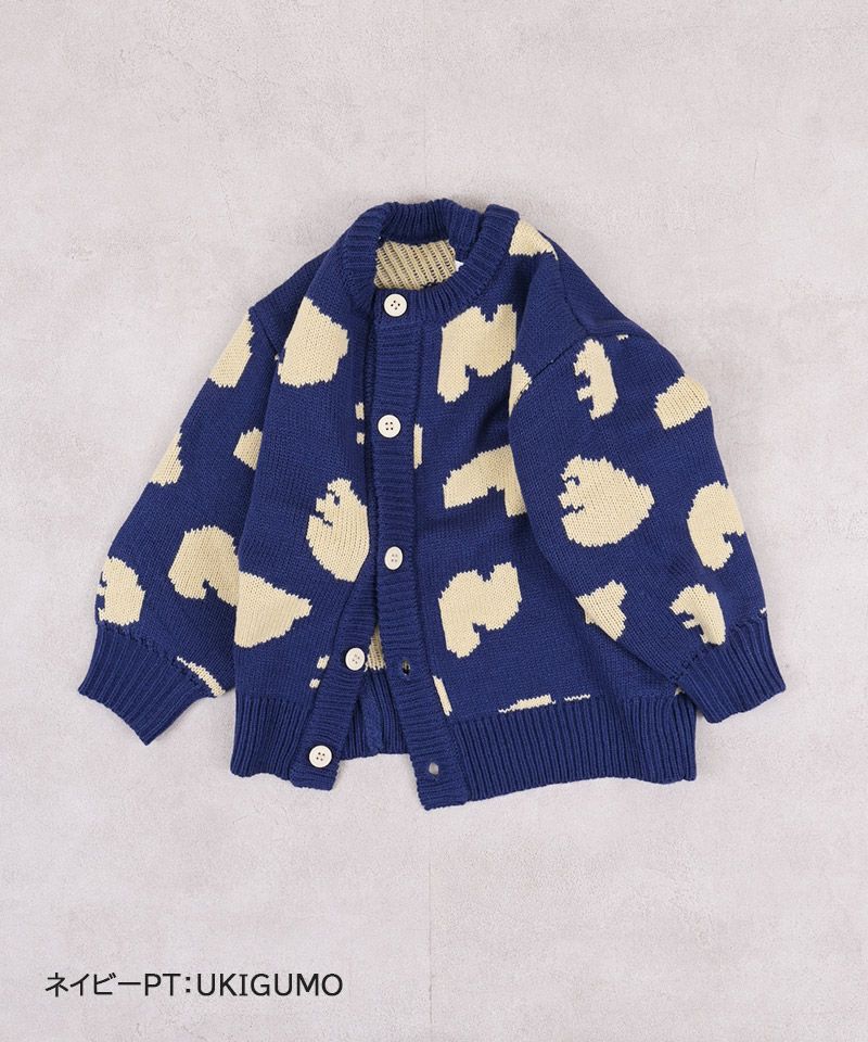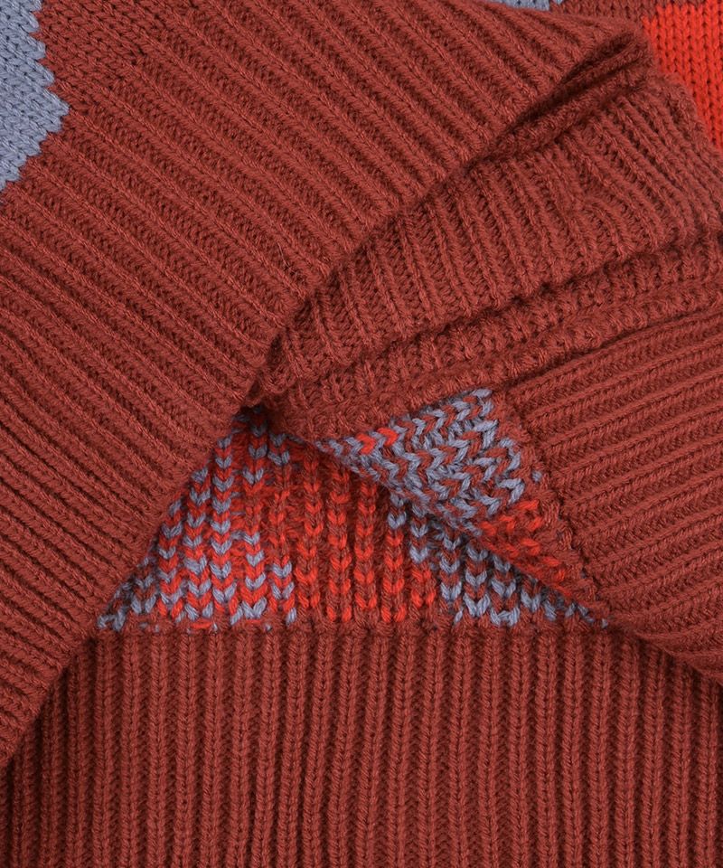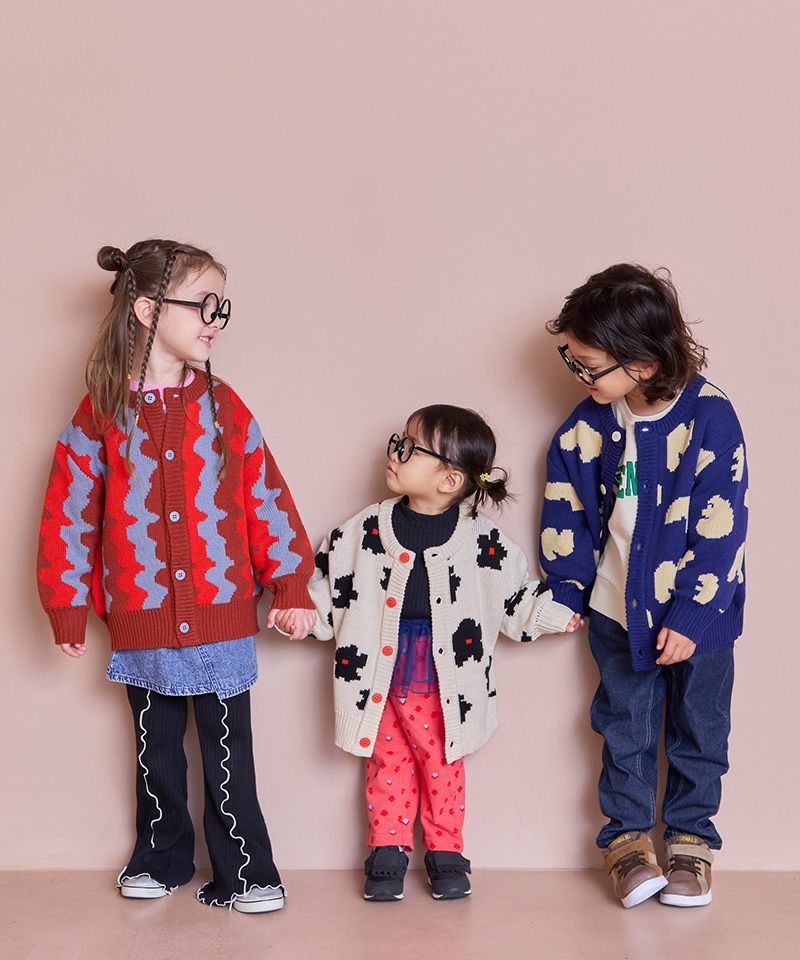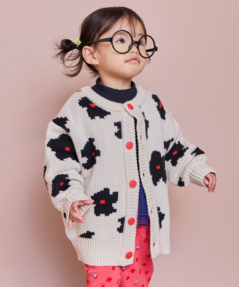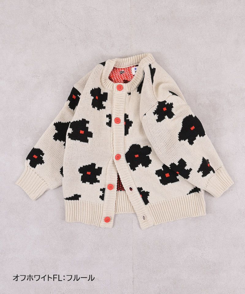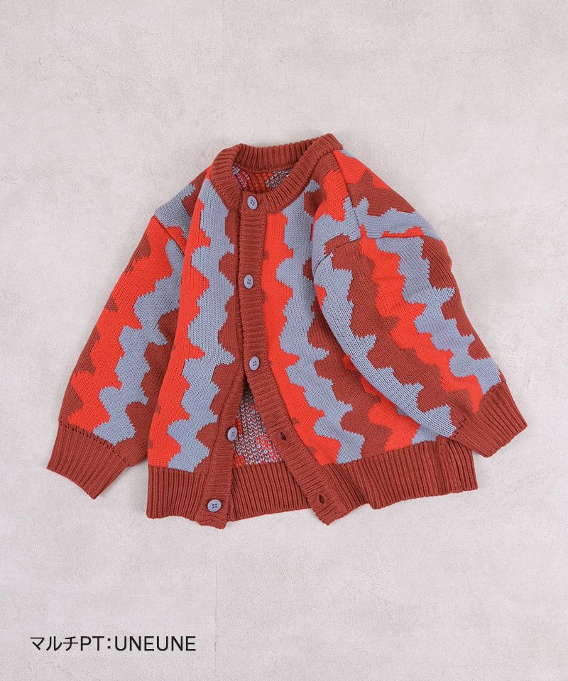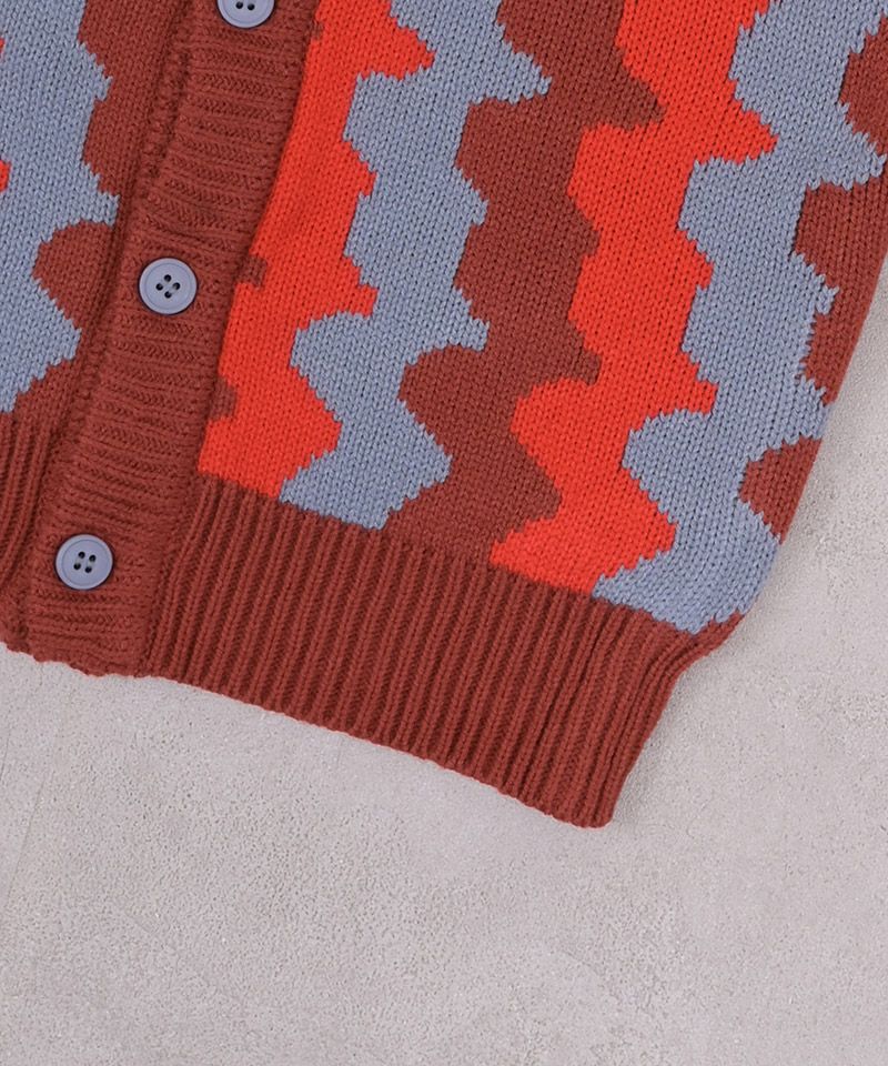 大胆な柄を全体に編み込んだ、存在感たっぷりのジャガードニットカーディガン。