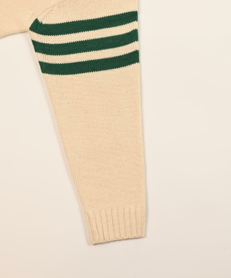 一枚でもサマになるロゴと袖のラインがあしらわれたニットで、古着スタイルっぽくカーゴパンツなどと合わせても相性抜群!
