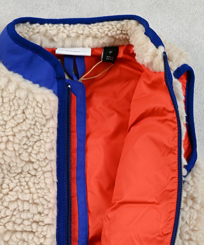 プラスチック汚染の危機にさらされている沿岸部の共同体から供給された、オーシャンサイクルの認証済みのリプリーブ・リサイクル・ポリエステル100%の13ミリ厚パイル・フリースで作ったソフトで快適な防風性ベスト。