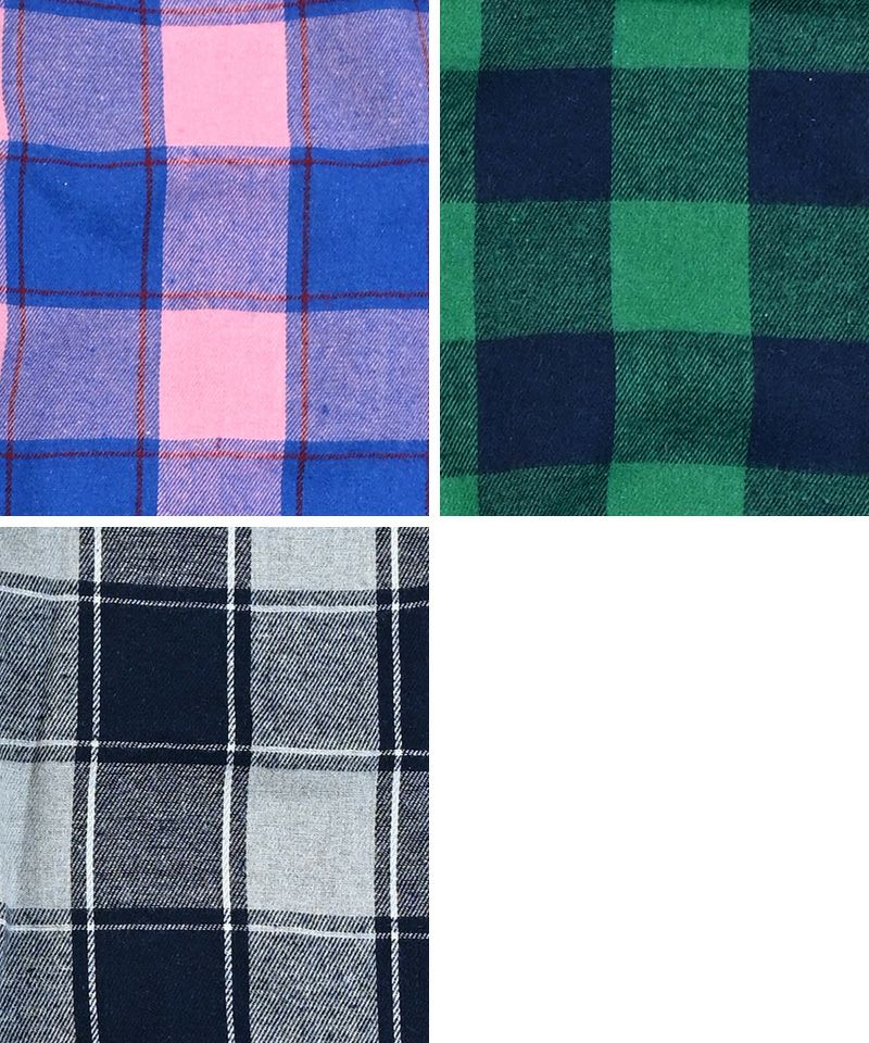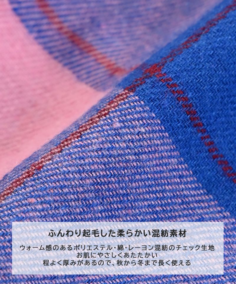 ポリエステル・綿・レーヨン混紡のチェック生地は、やわらかくて肌ざわりが優しい一枚。