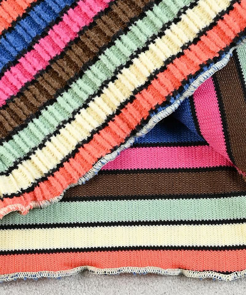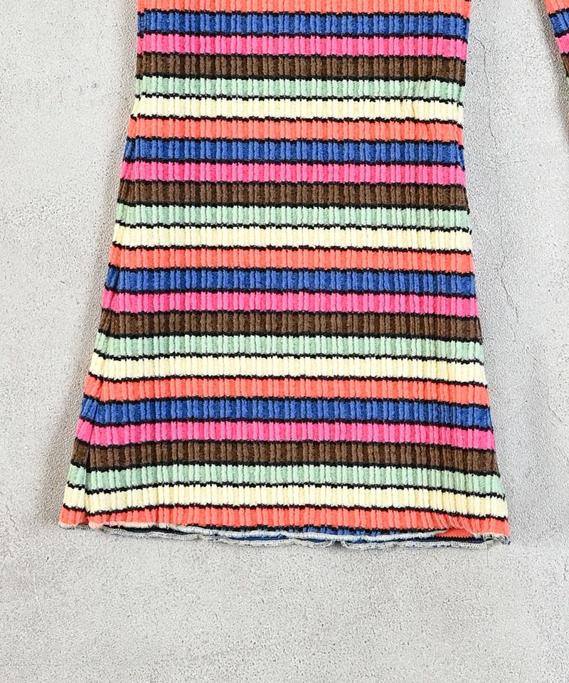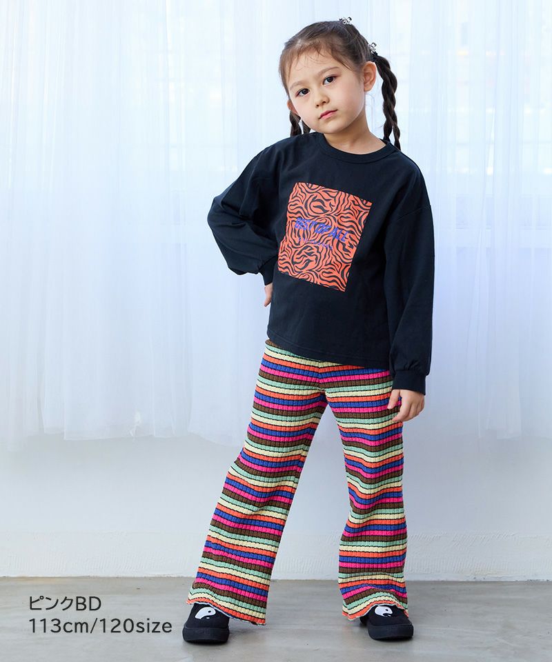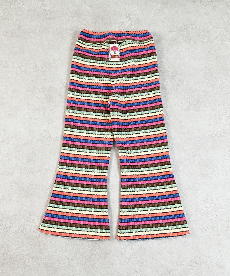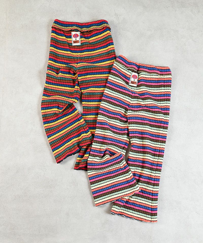 元気いっぱいのマルチボーダー柄が目を引くフレアパンツ。