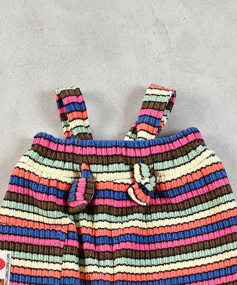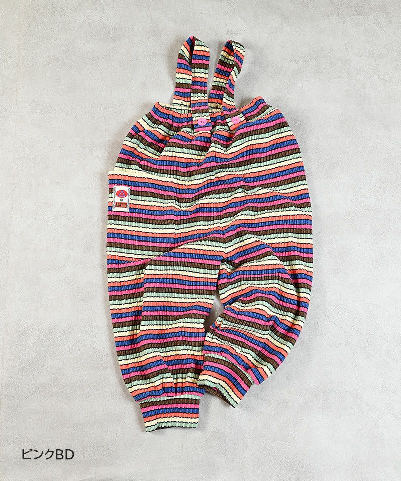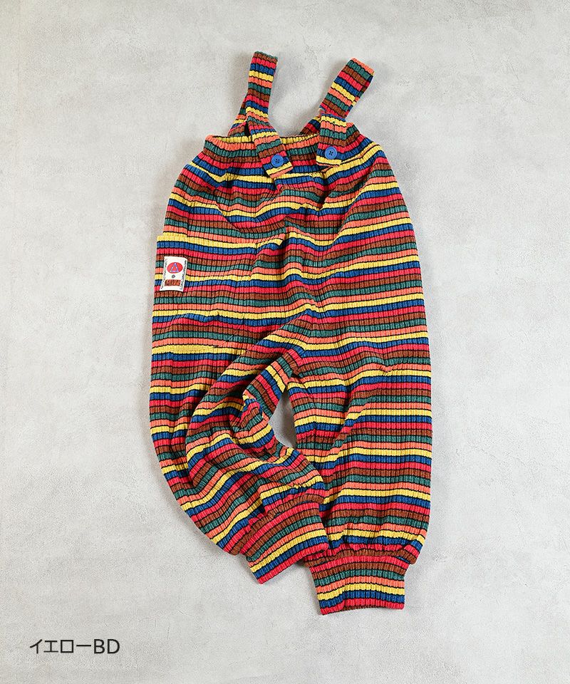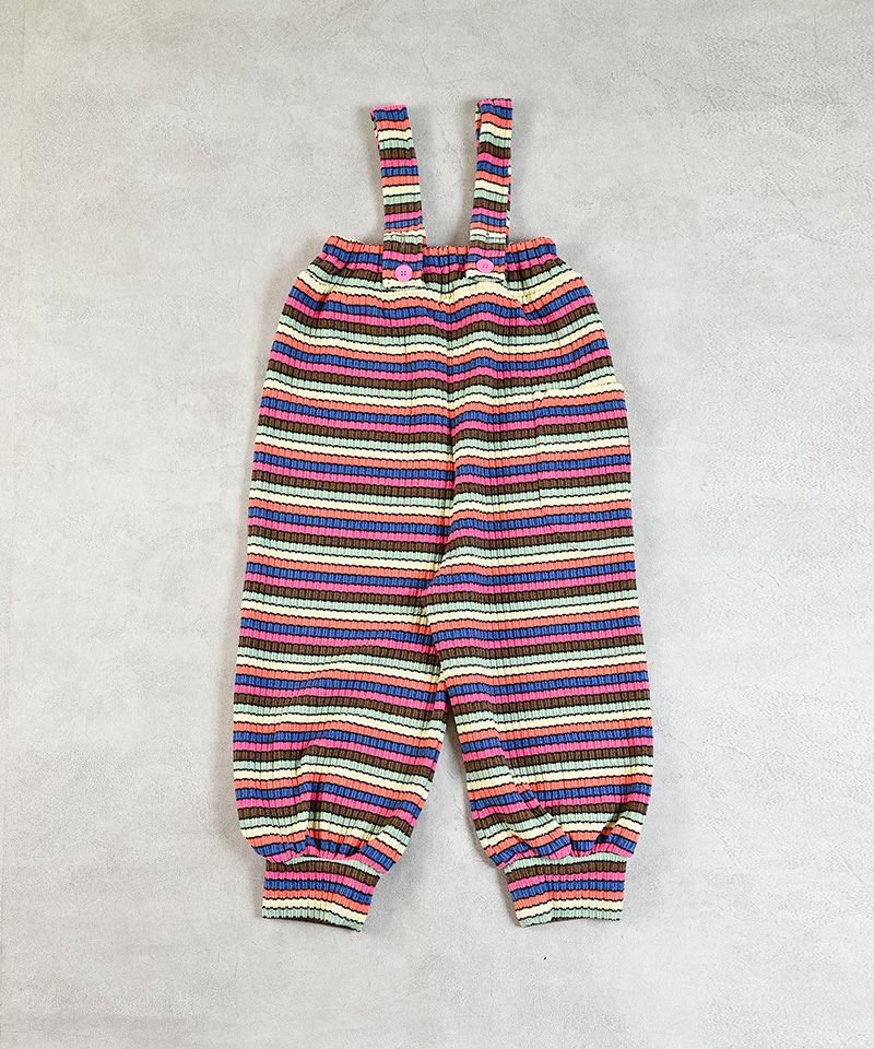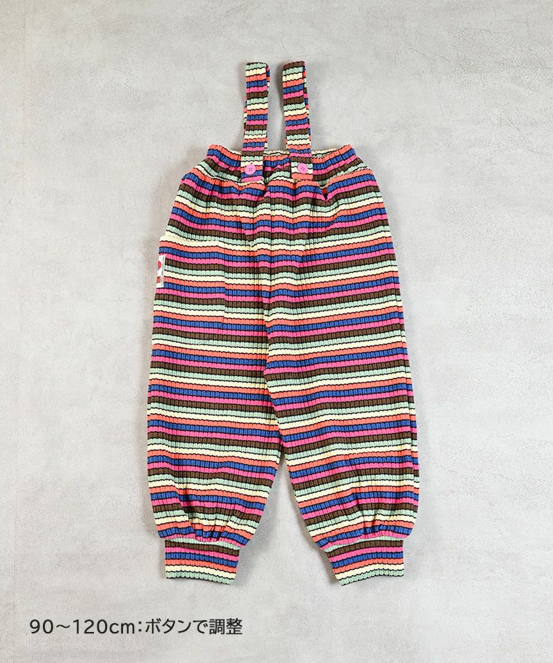 元気いっぱいのマルチボーダー柄が目を引くサロペット。