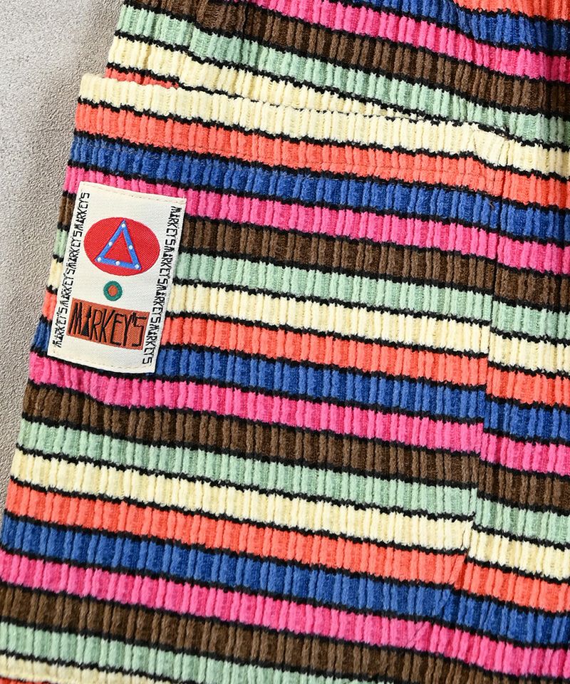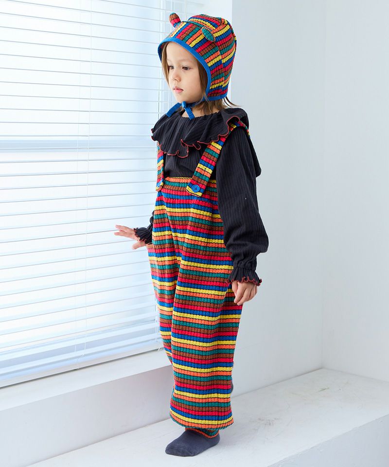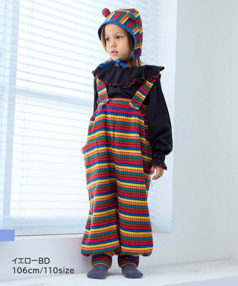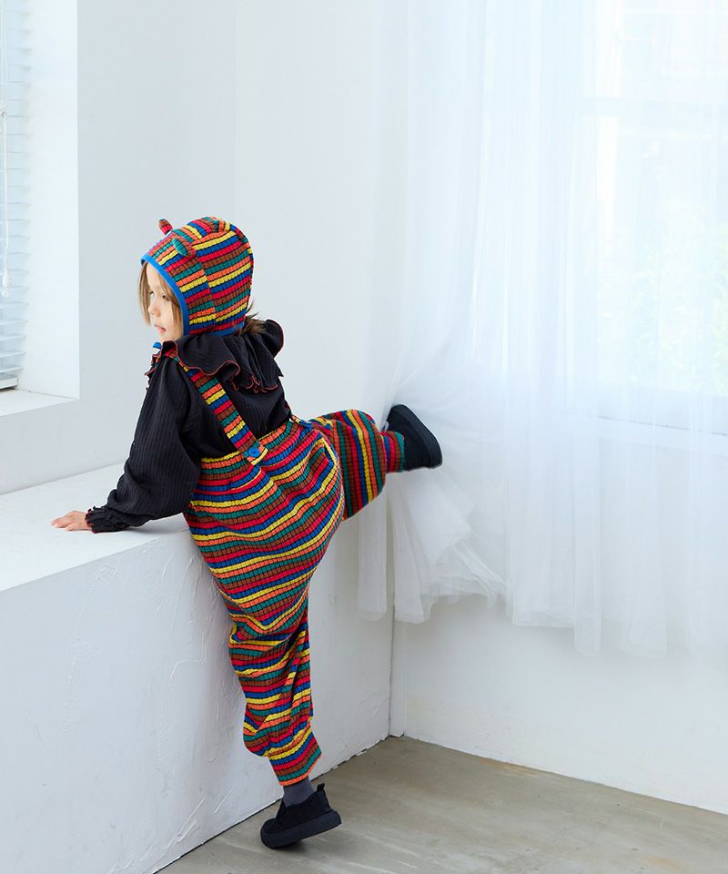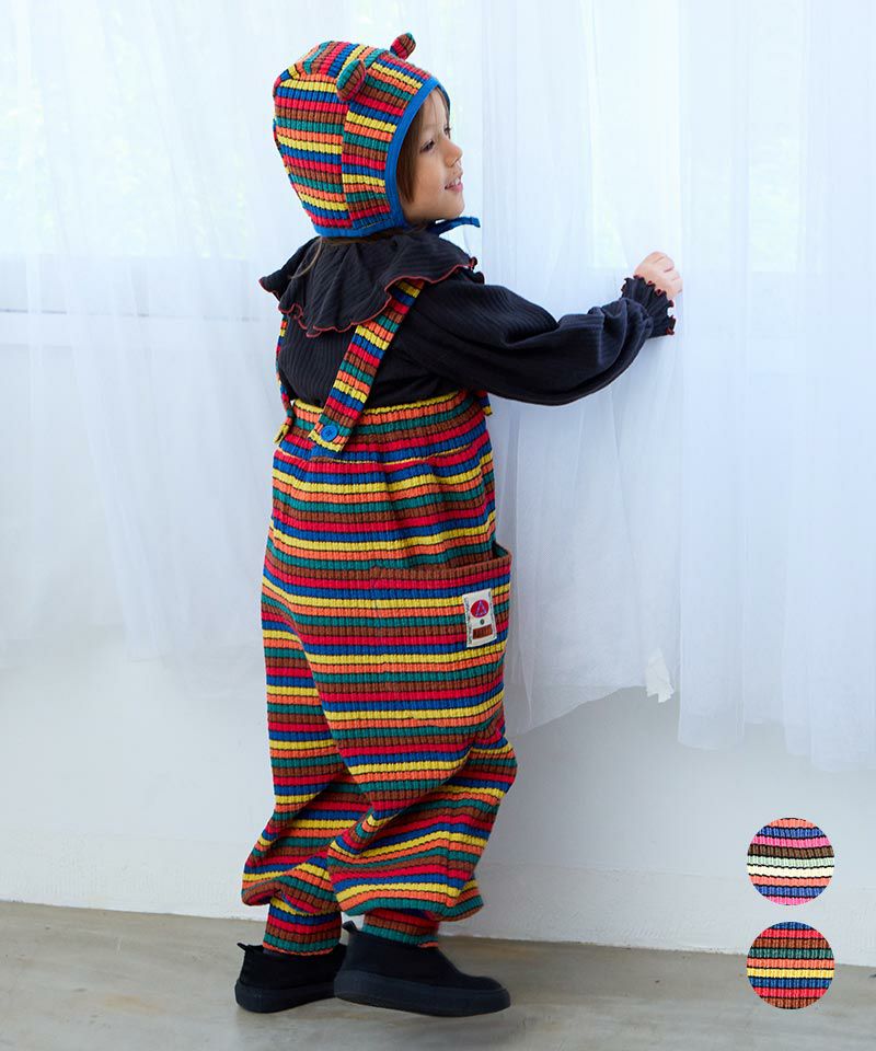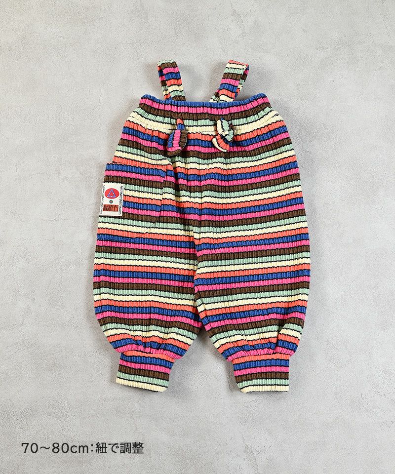 元気いっぱいのマルチボーダー柄が目を引くサロペット。