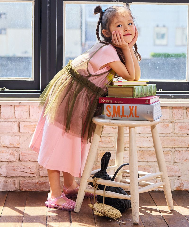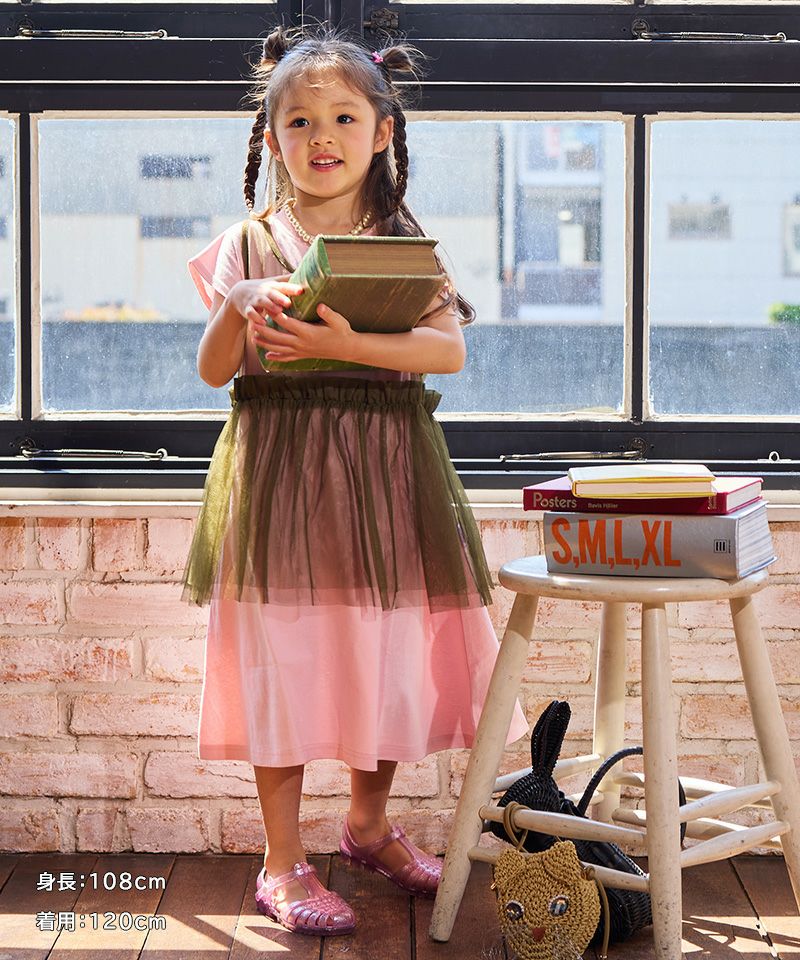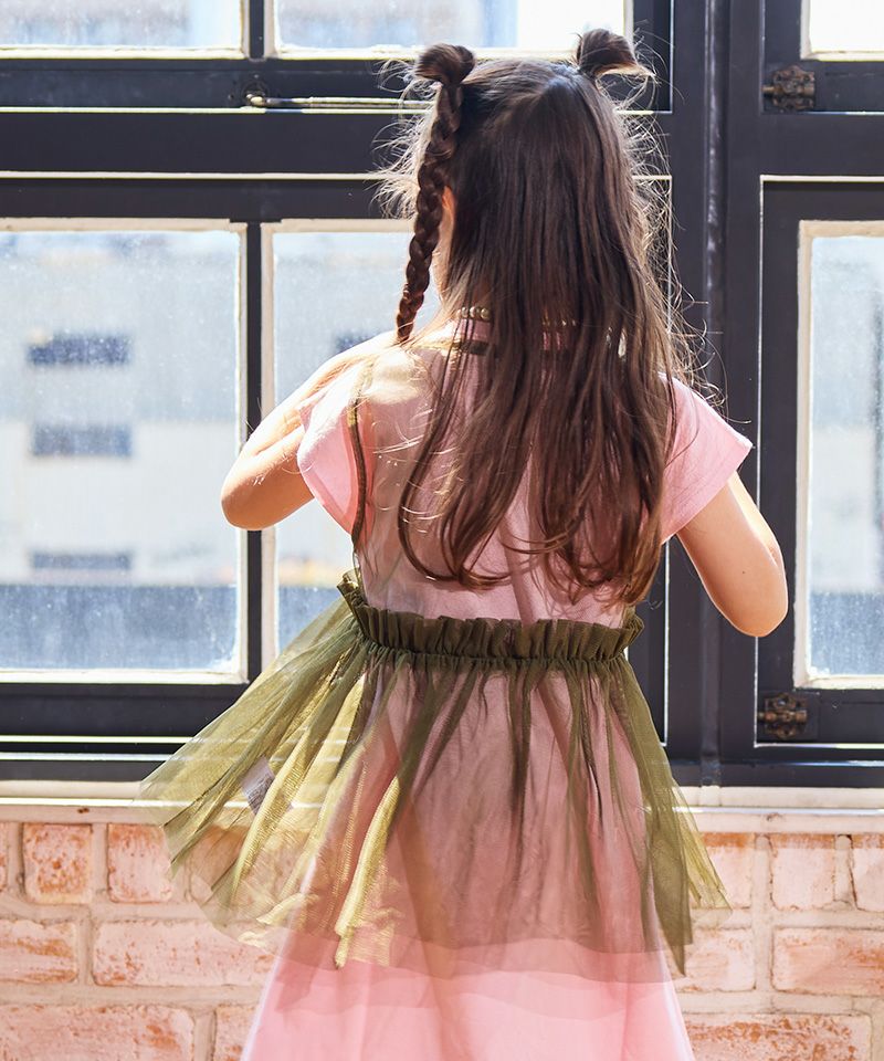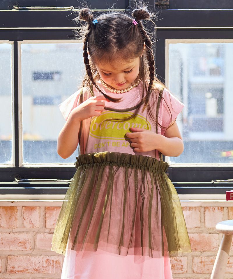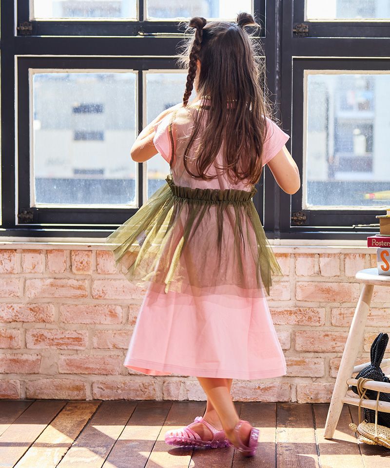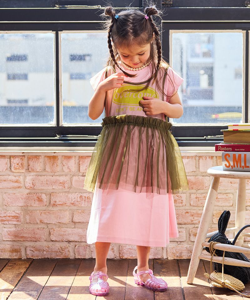 デイリーユースにピッタリなワンピースですが、チュールをプラスするだけで一気にオシャレなスタイリングに。