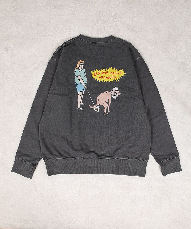 BACKのプリントで犬の散歩中の出来事をFRONTで犬自らが掃除してるなんとも言えないユーモア溢れた商品になっています。