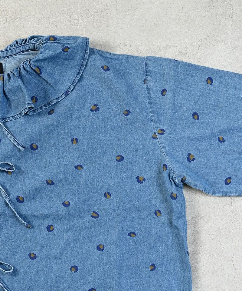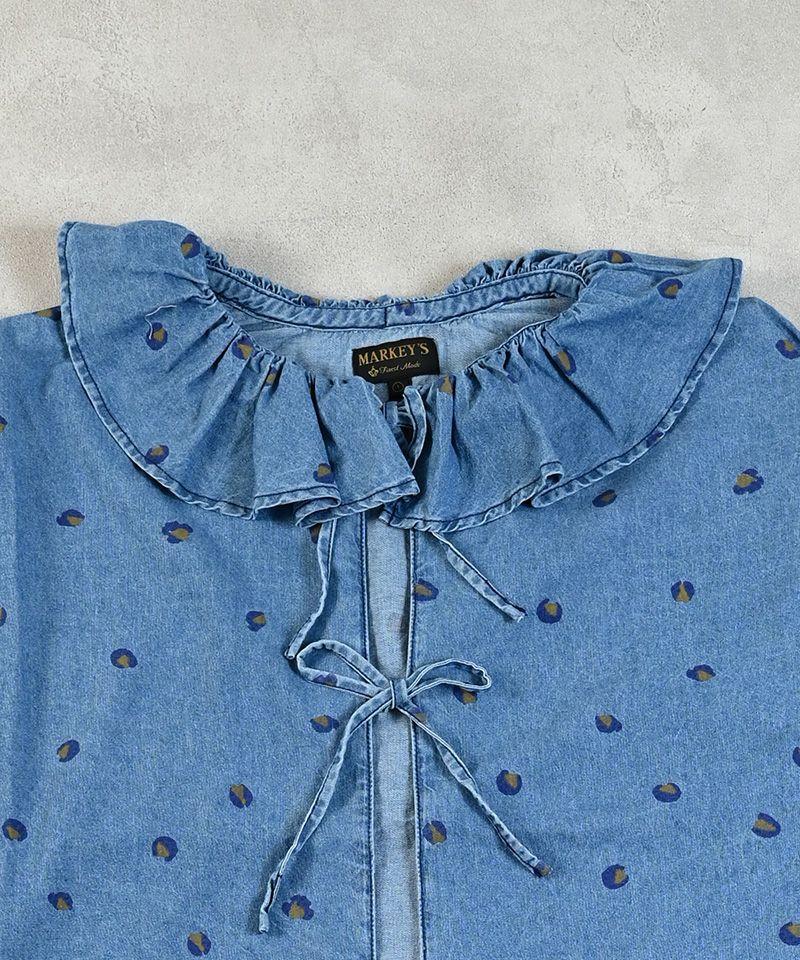 デニム+レオパードプリントにフリルカラーがポイントのブラウス。
