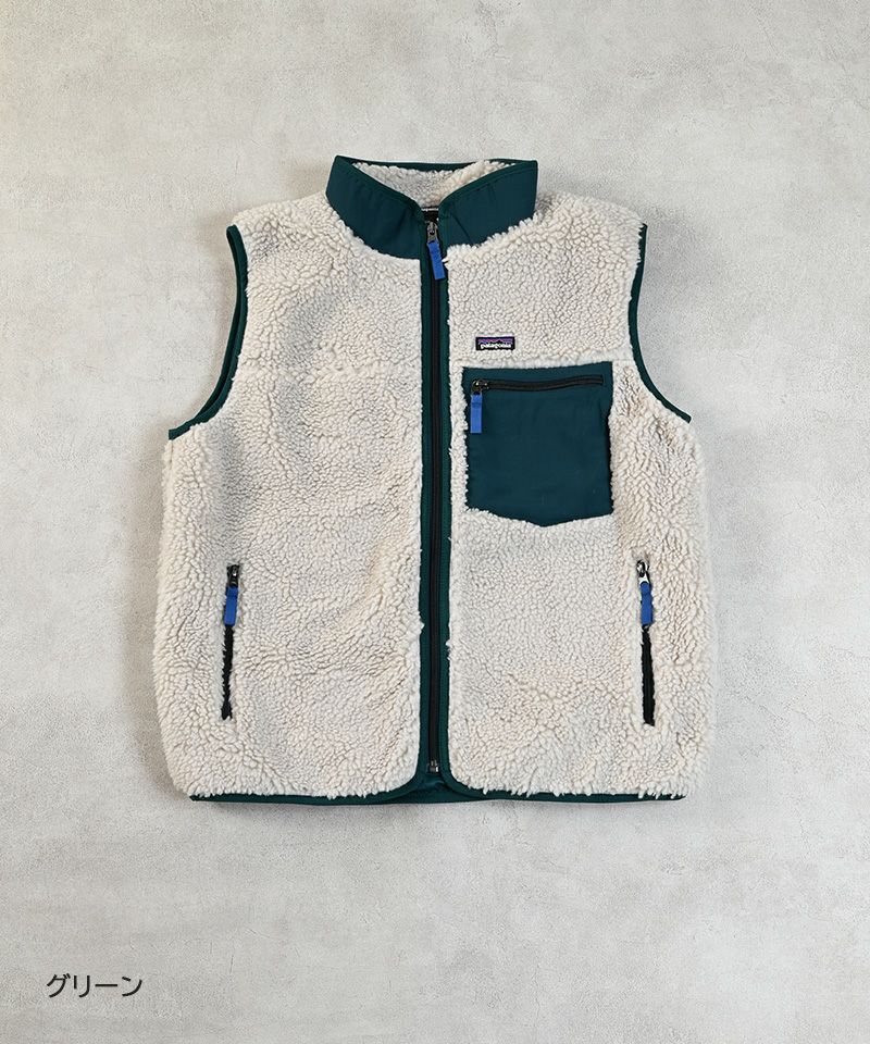 ソフトなリサイクル・ポリエステル100%の6ミリ厚パイル・フリースを使用した、防風性と保温性を提供するキッズ用のレトロX・ベストは、リサイクル・ポリエステル100%のタフタの裏地付き。