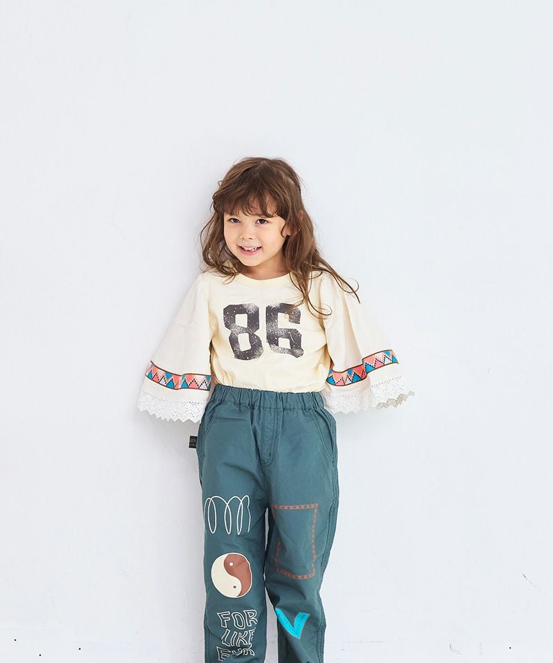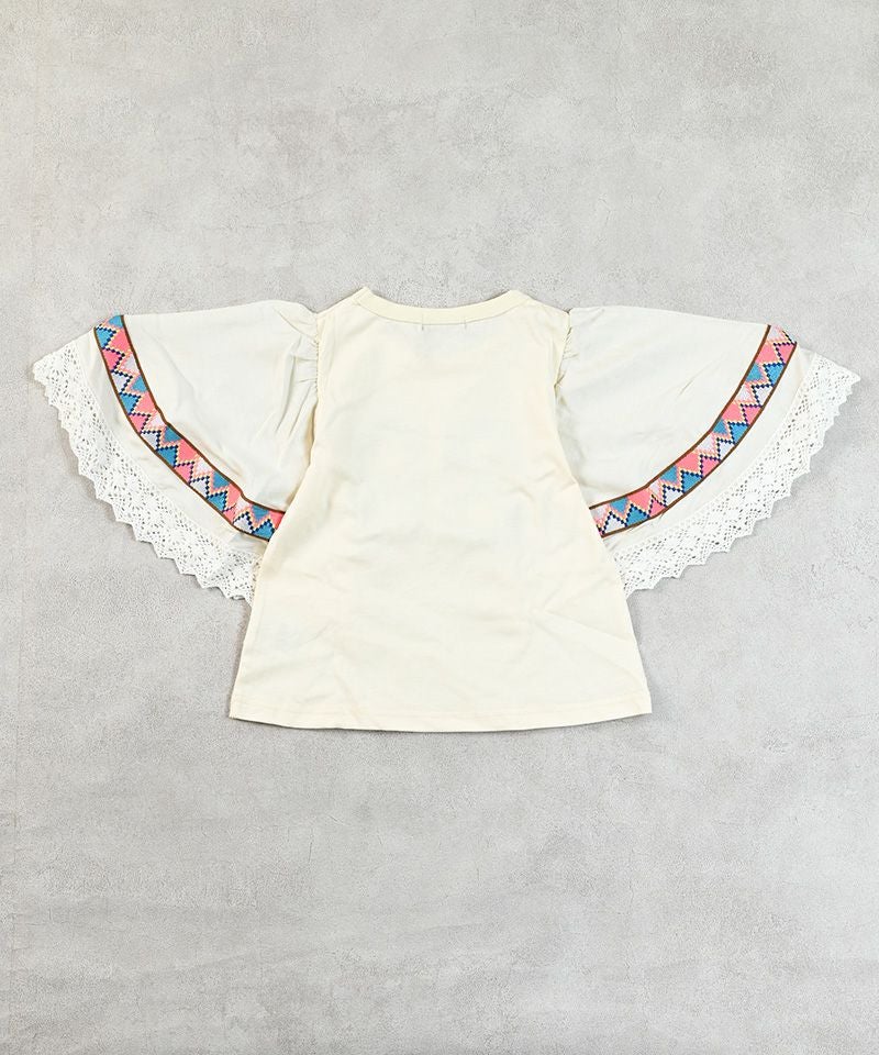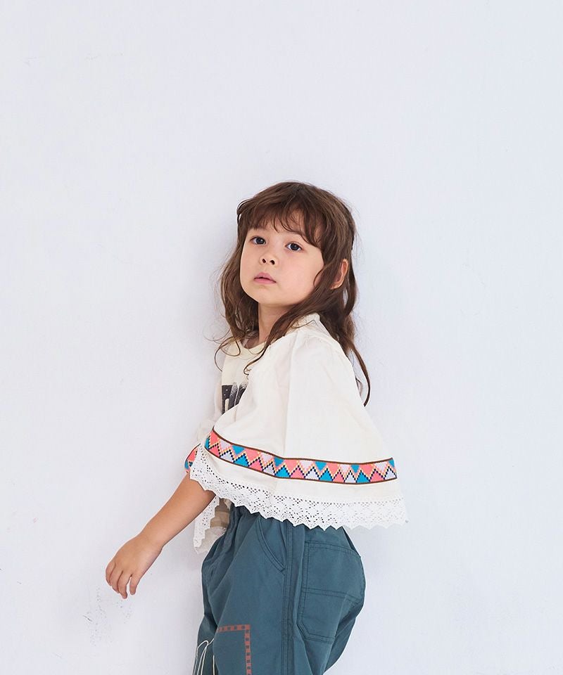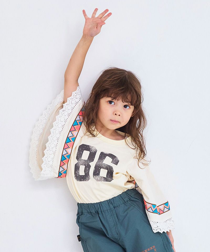 ワイドな袖には異素材切り替えを取り入れ、カラフルなテープとレースをあしらった個性的なデザイン。