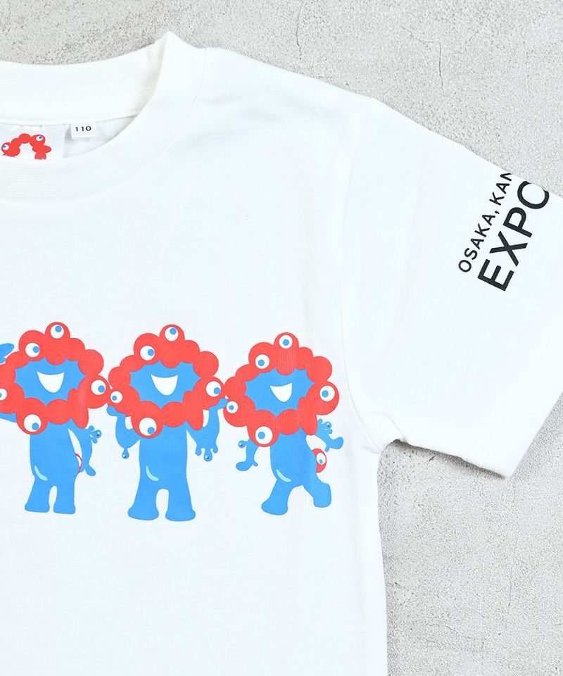 大阪・関西万博公式キャラクター「ミャクミャク」を胸に大きくあしらい、左袖ににロゴをプリントしたTシャツです。