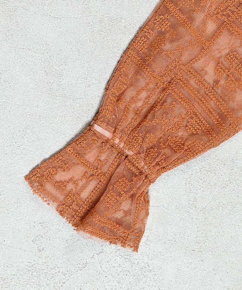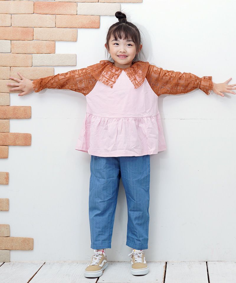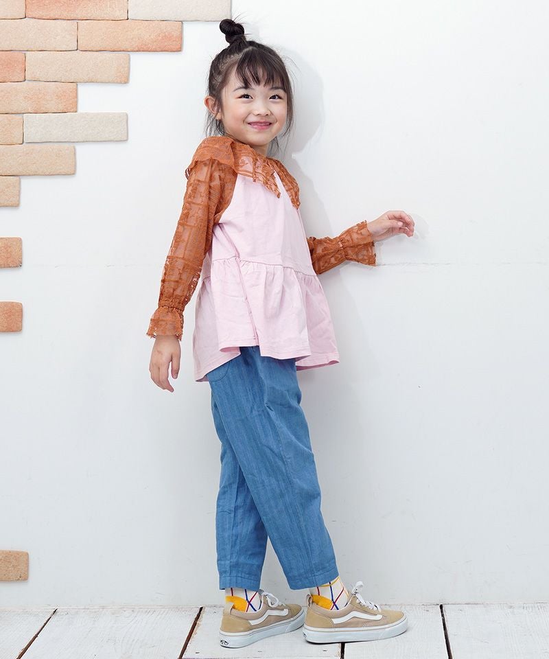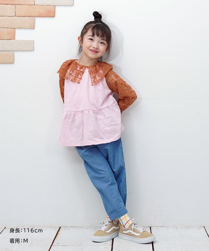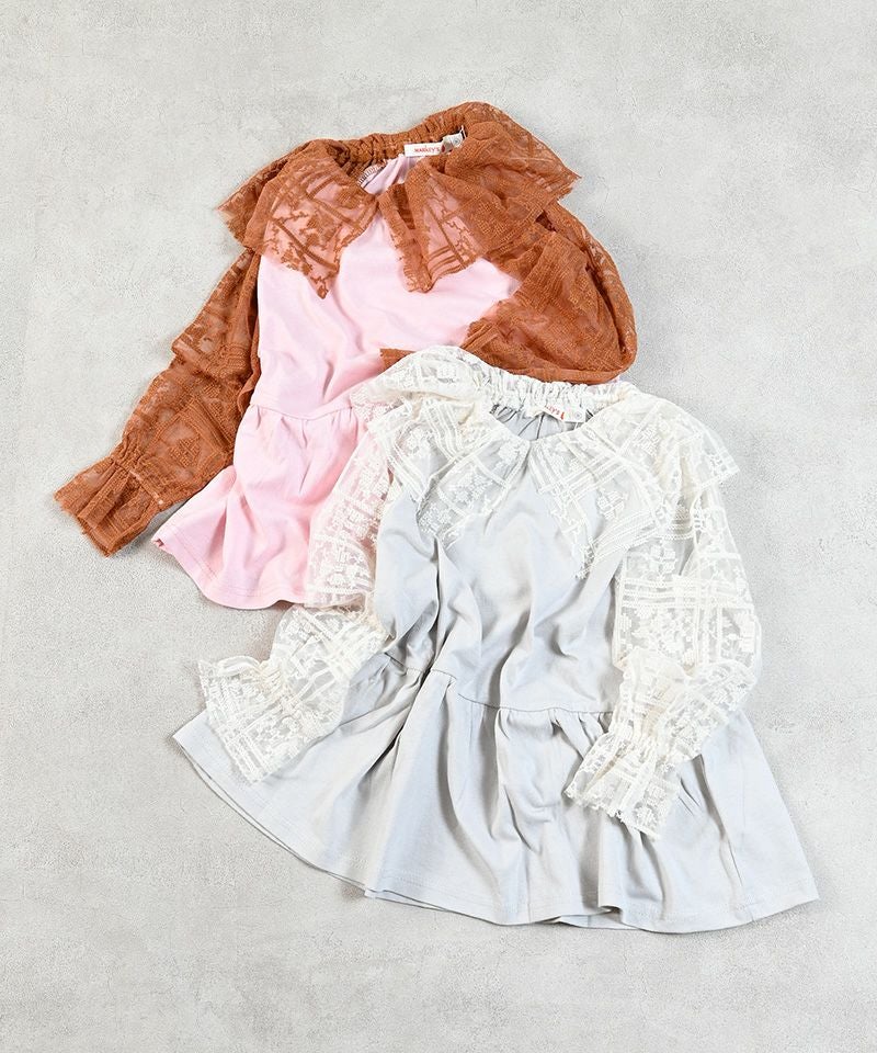 襟と袖にあしらわれたふわっと膨らみのあるレースがガーリーな印象に。