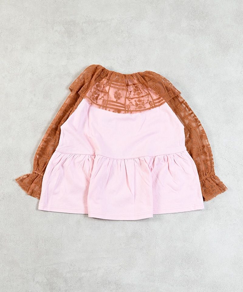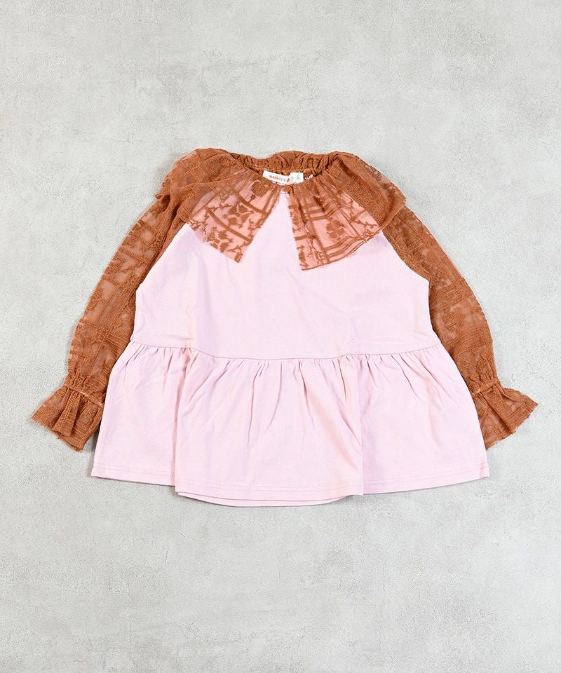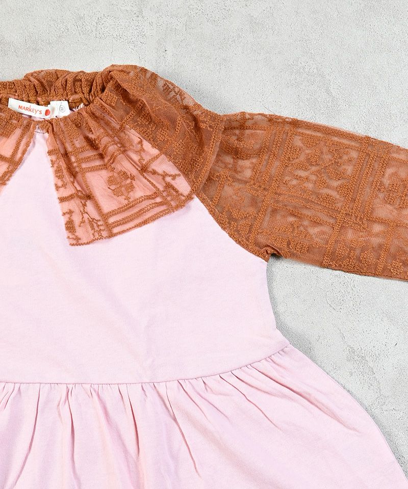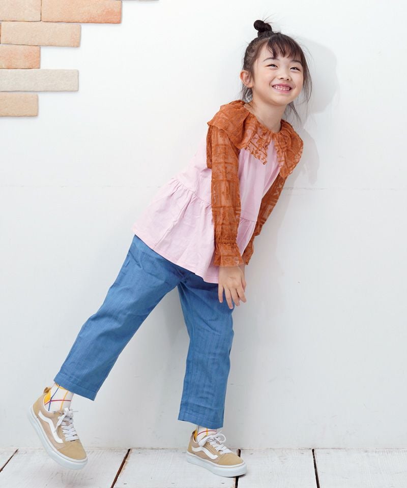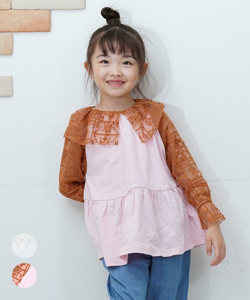 襟と袖にあしらわれたふわっと膨らみのあるレースがガーリーな印象に。