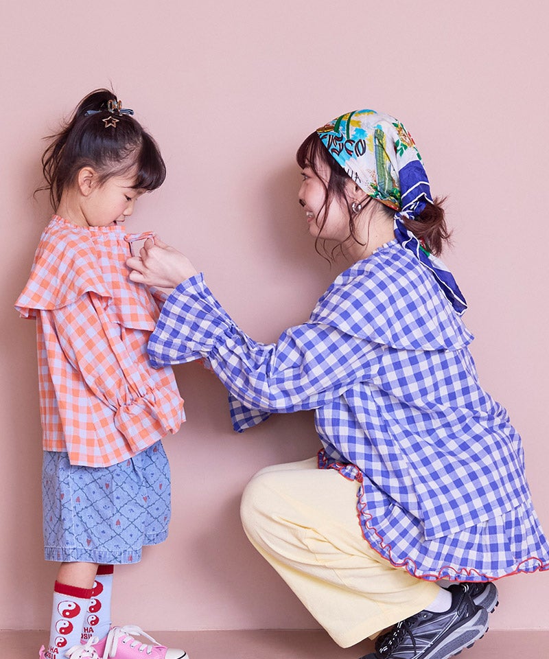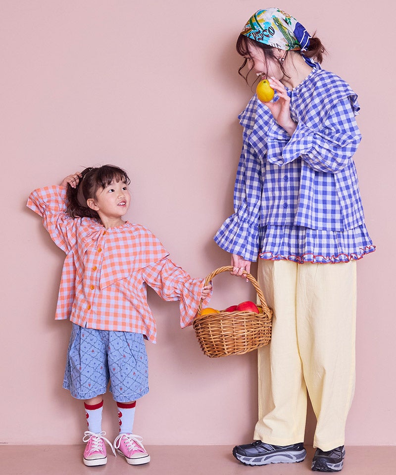 襟ぐりのリボンとフロントボタンで、きちんと感とかわいさを両立しました。