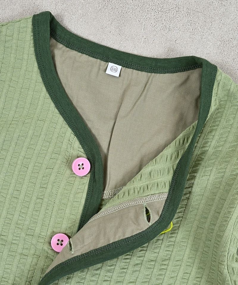 配色パイピングとカラーボタンが程よいアクセントになり、シンプルながらも遊び心のあるデザインに仕上げました。