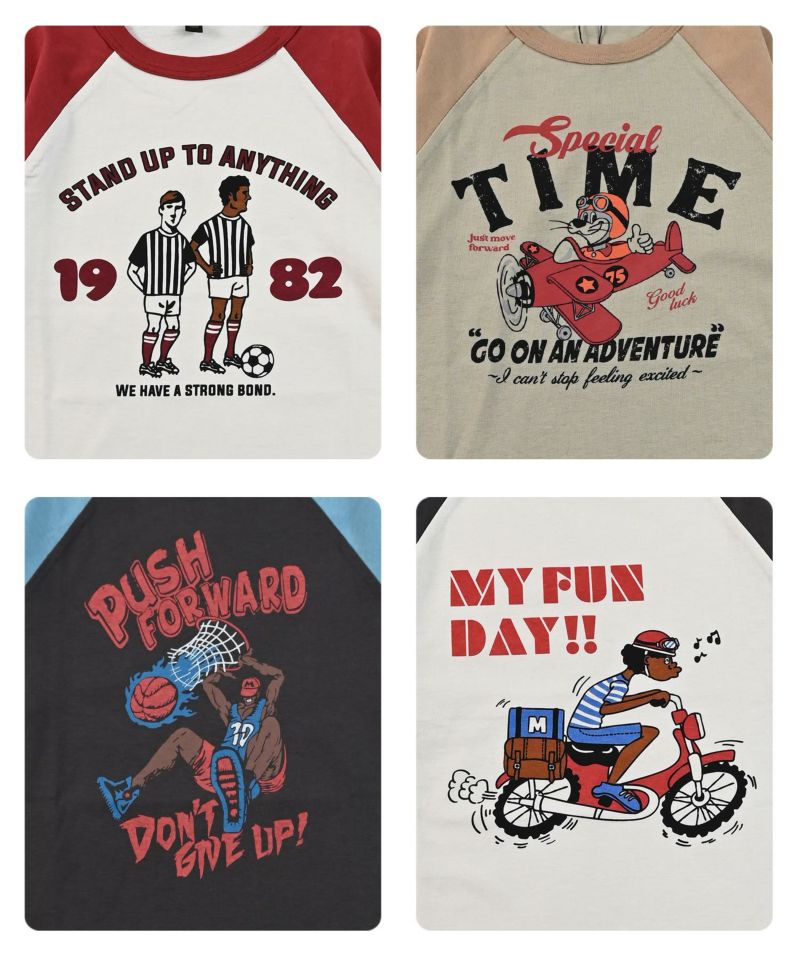 ラグランスリーブの切り替えしカラー配色もポイントです。