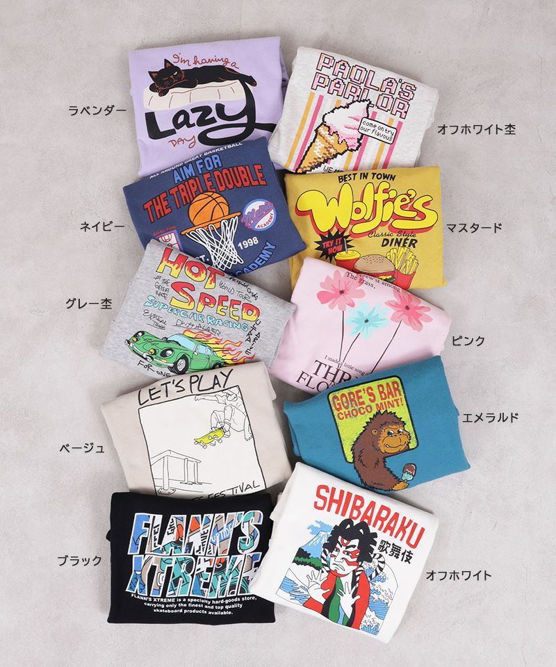 プリント加工の商品は、着用や洗濯を繰り返すことで、プリント部分がひび割れたり、剥がれたりする場合があります。また、プリント面同士が触れ合う状態で保管すると、くっついたり剥離したりすることがありますので、重ねて保管しないようご注意ください。