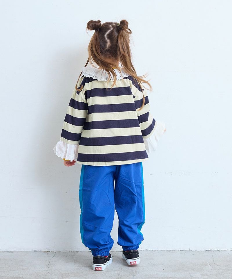 存在感のあるボーダー柄に、アイレットレースのフリル襟を合わせた主役トップスです。