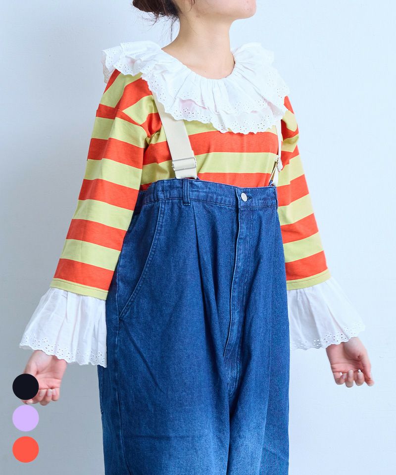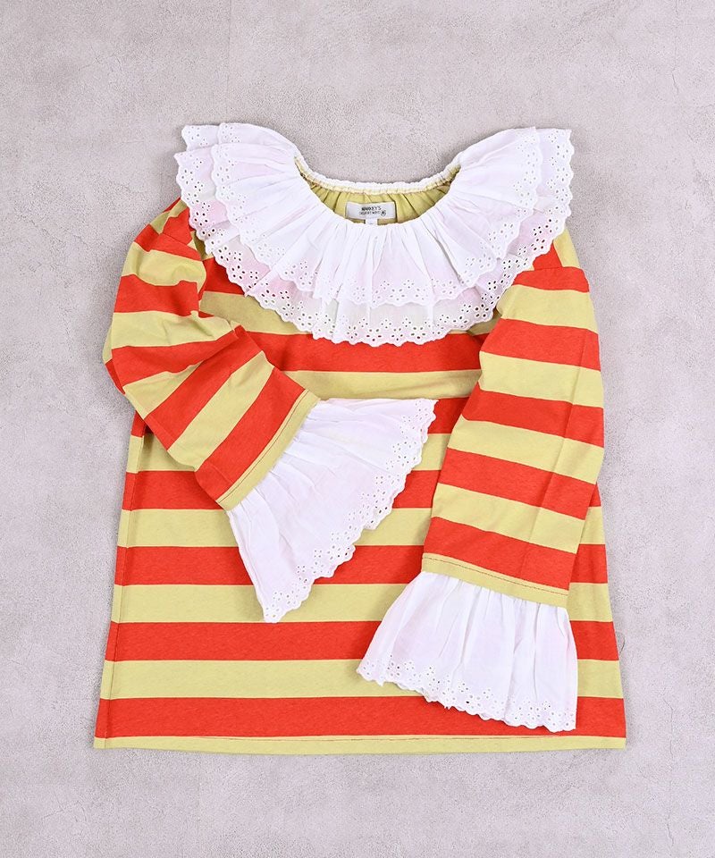 存在感のあるボーダー柄に、アイレットレースのフリル襟を合わせた主役トップスです。