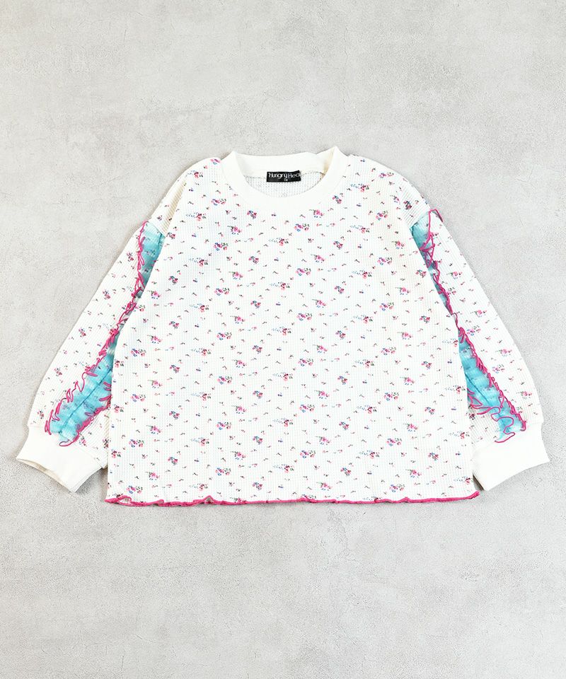身頃はやわらかなワッフル素材で、袖部分にチュールを重ねたデザインロンT。