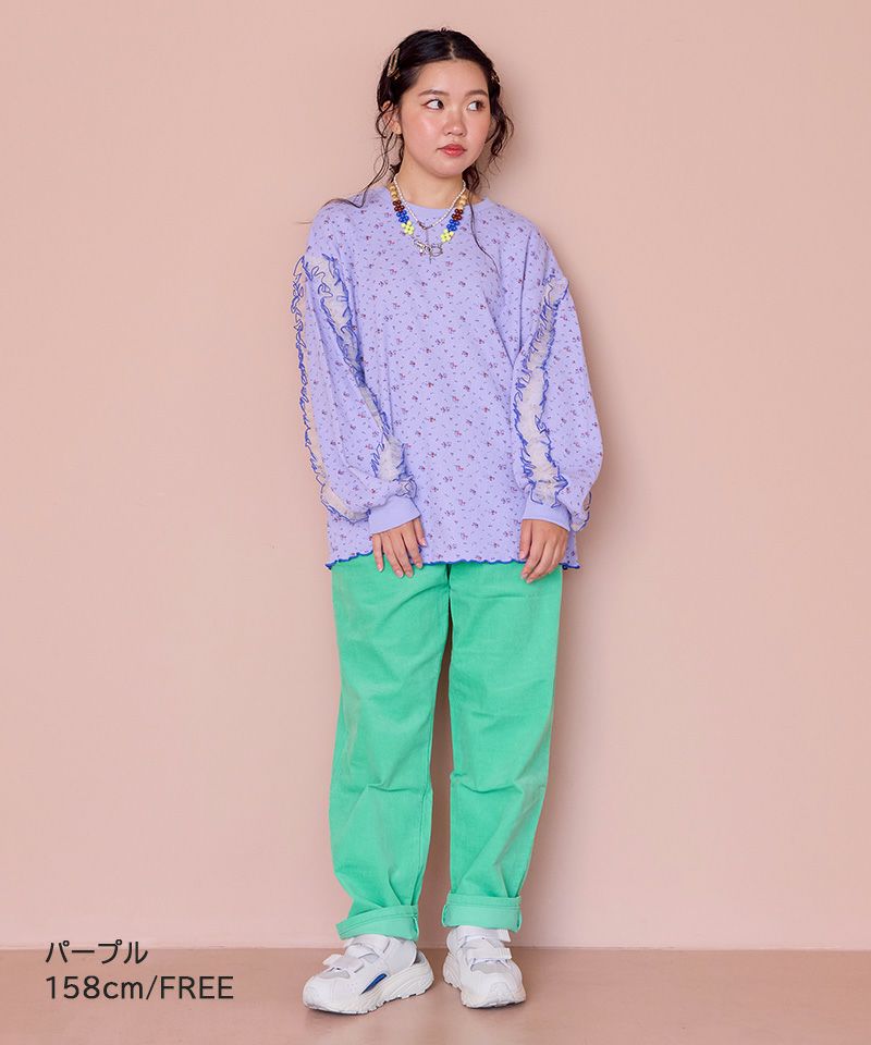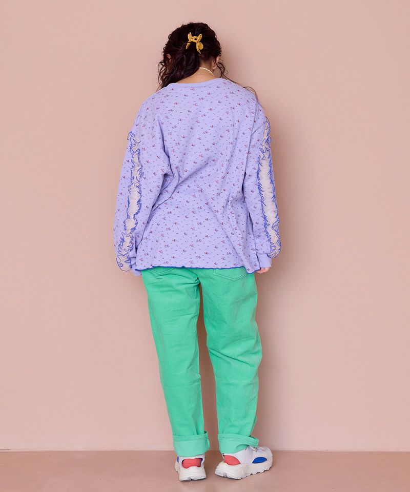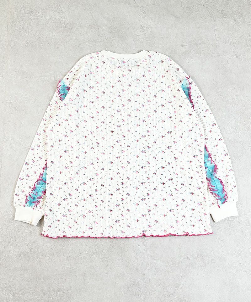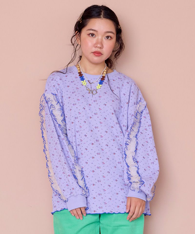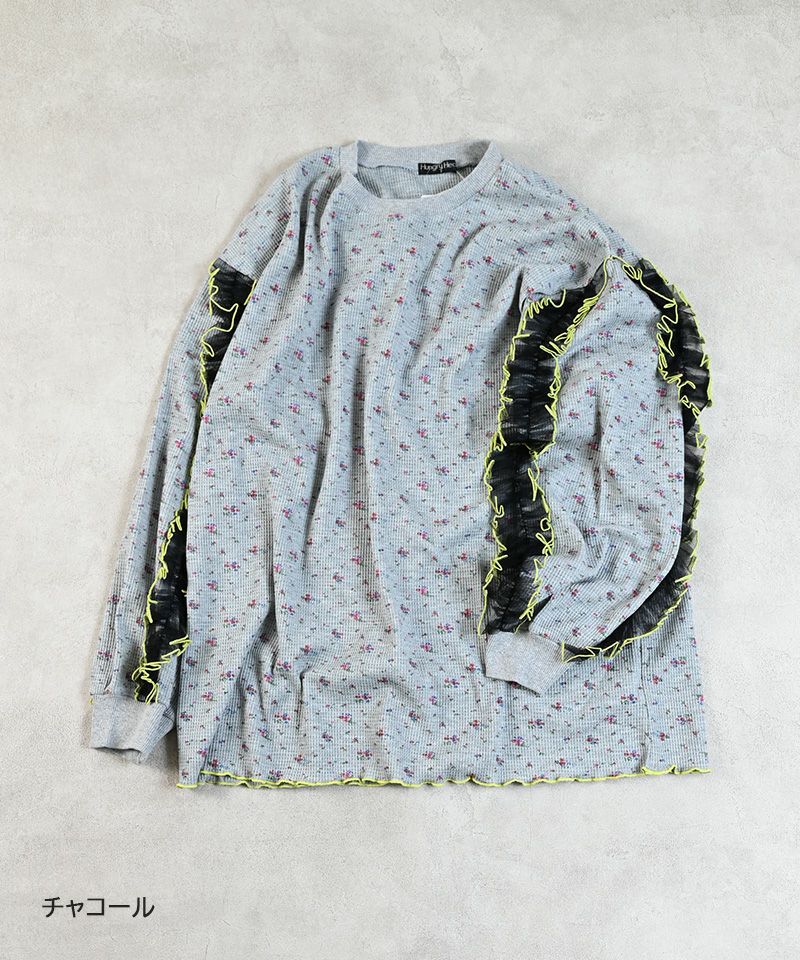 身頃はやわらかなワッフル素材で、袖部分にチュールを重ねたデザインロンT。