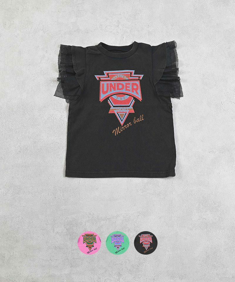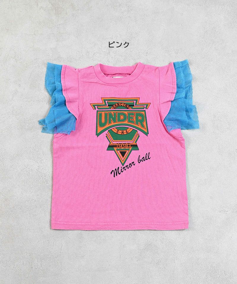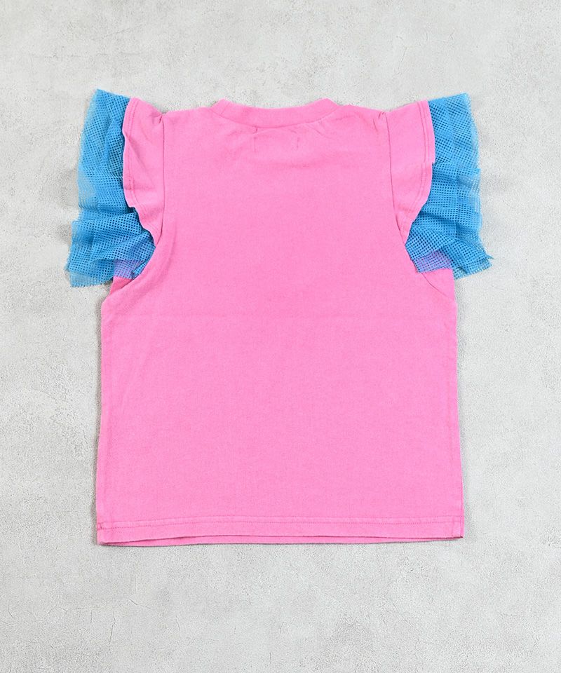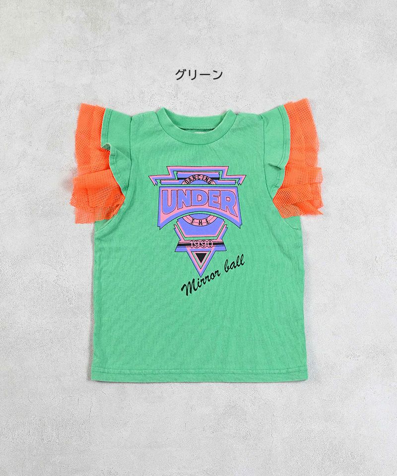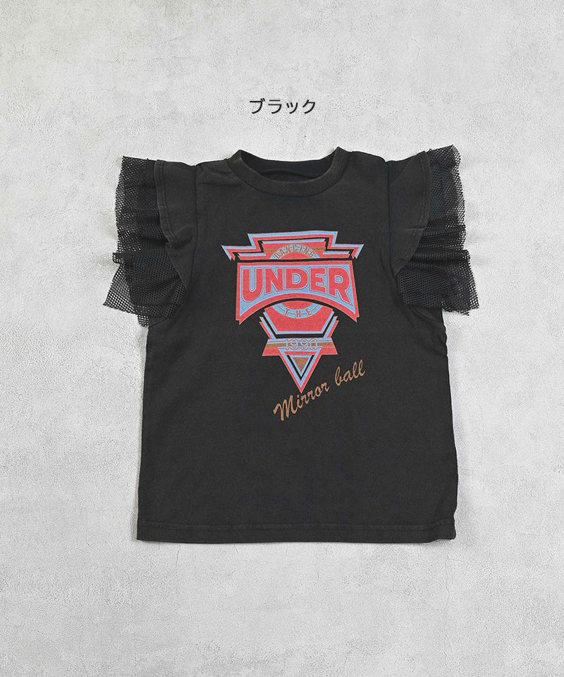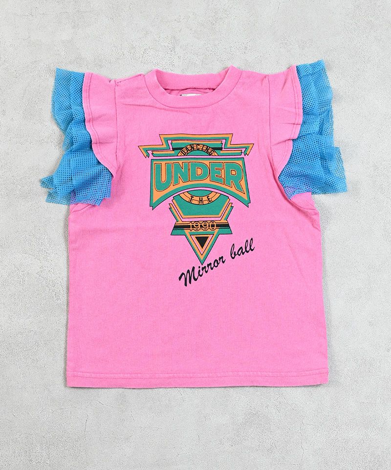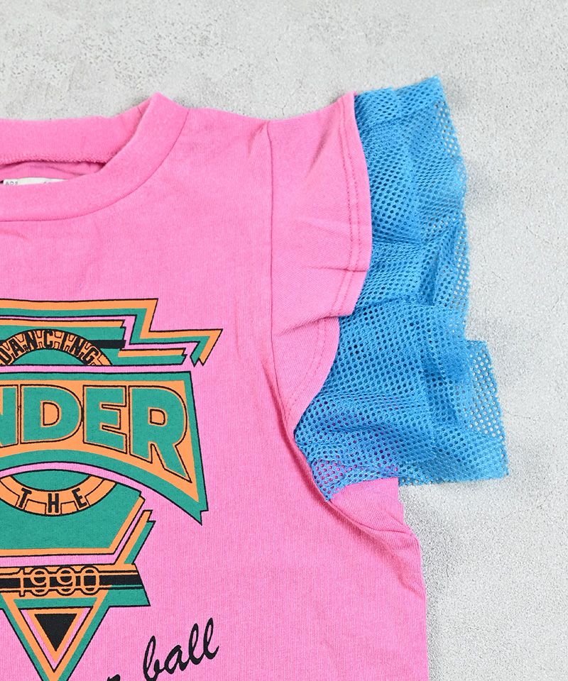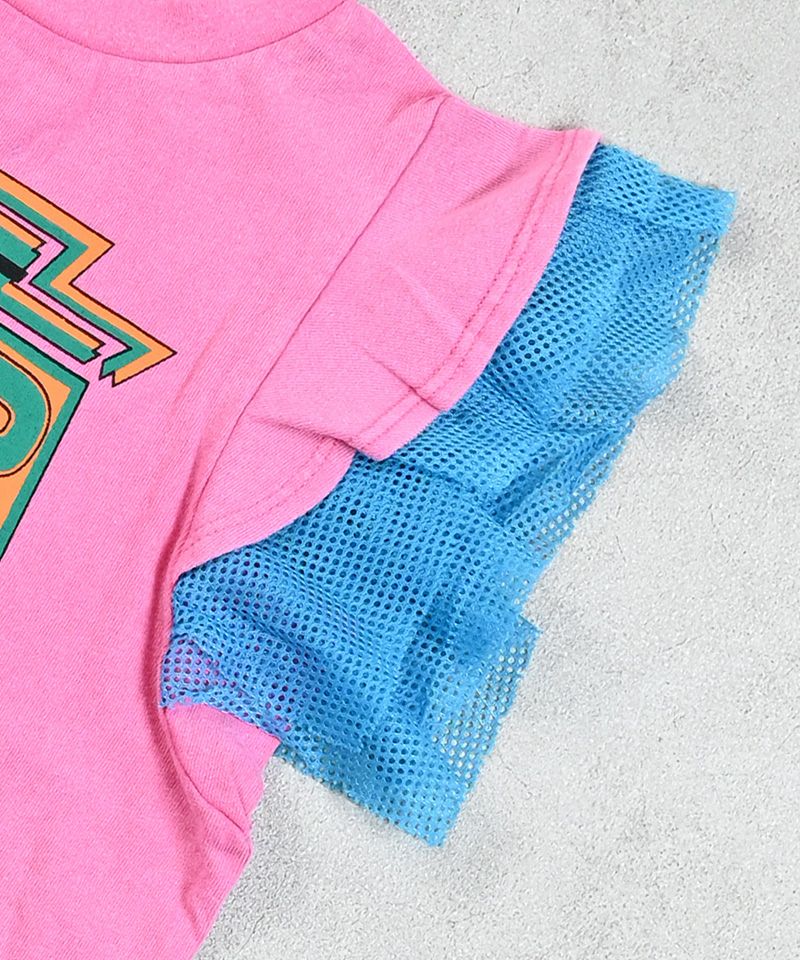 メッシュ素材の袖フリルと’90s風の図案がポイントのTシャツ。