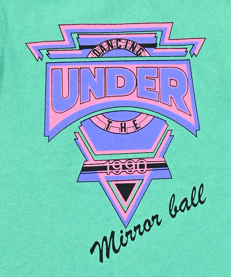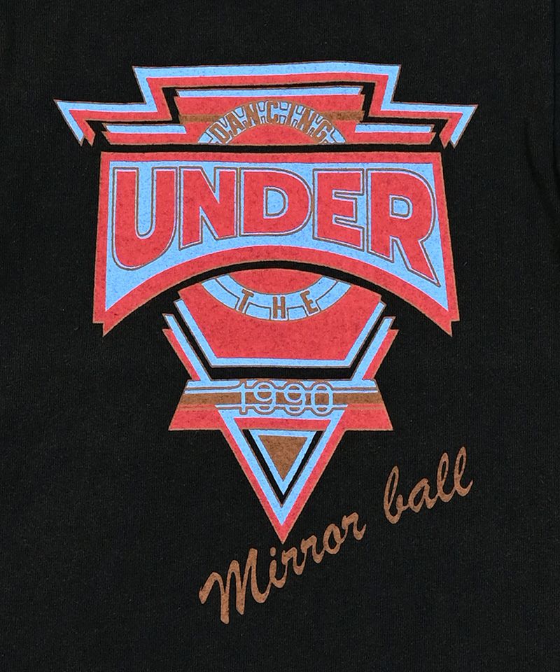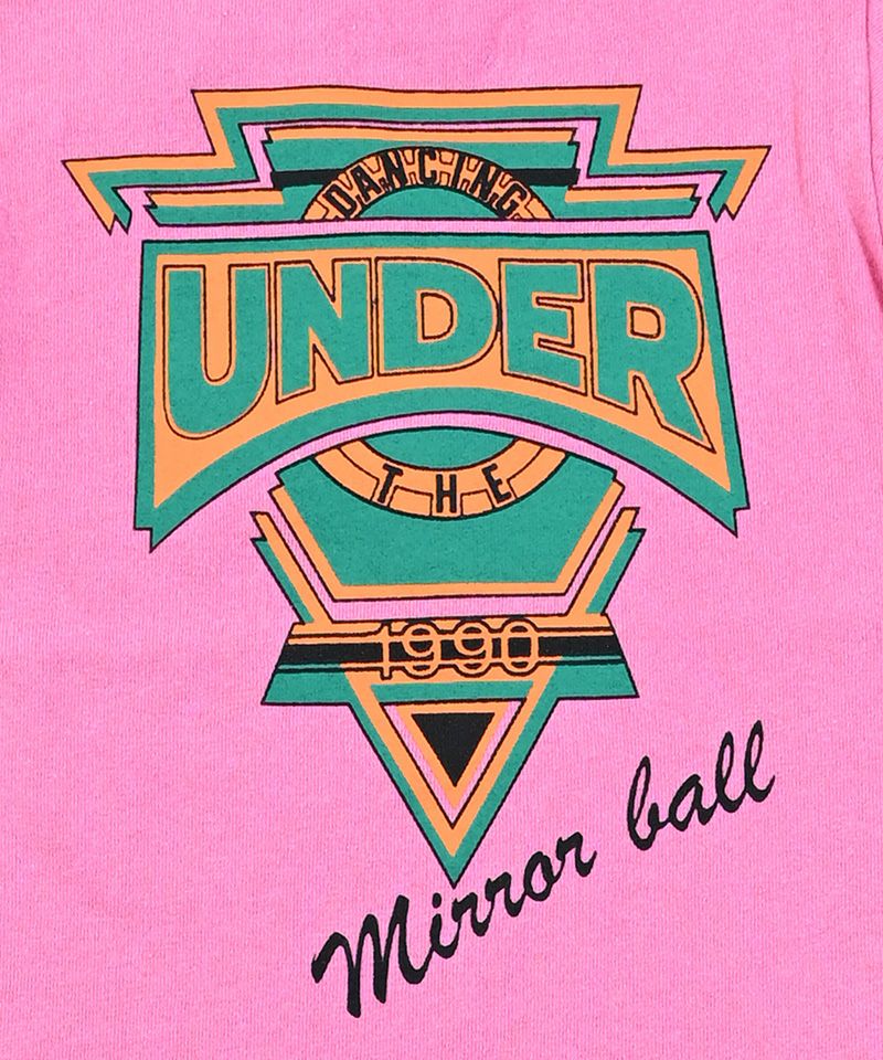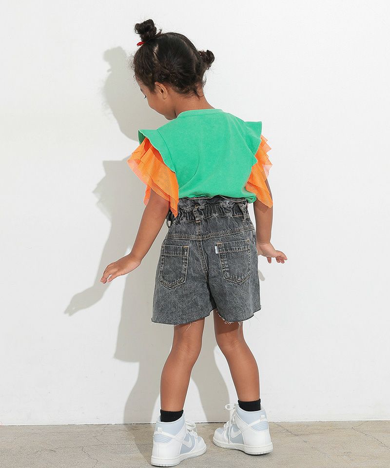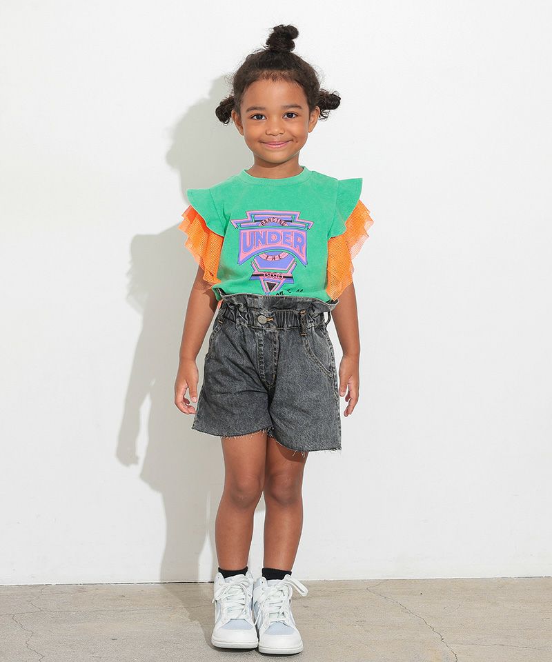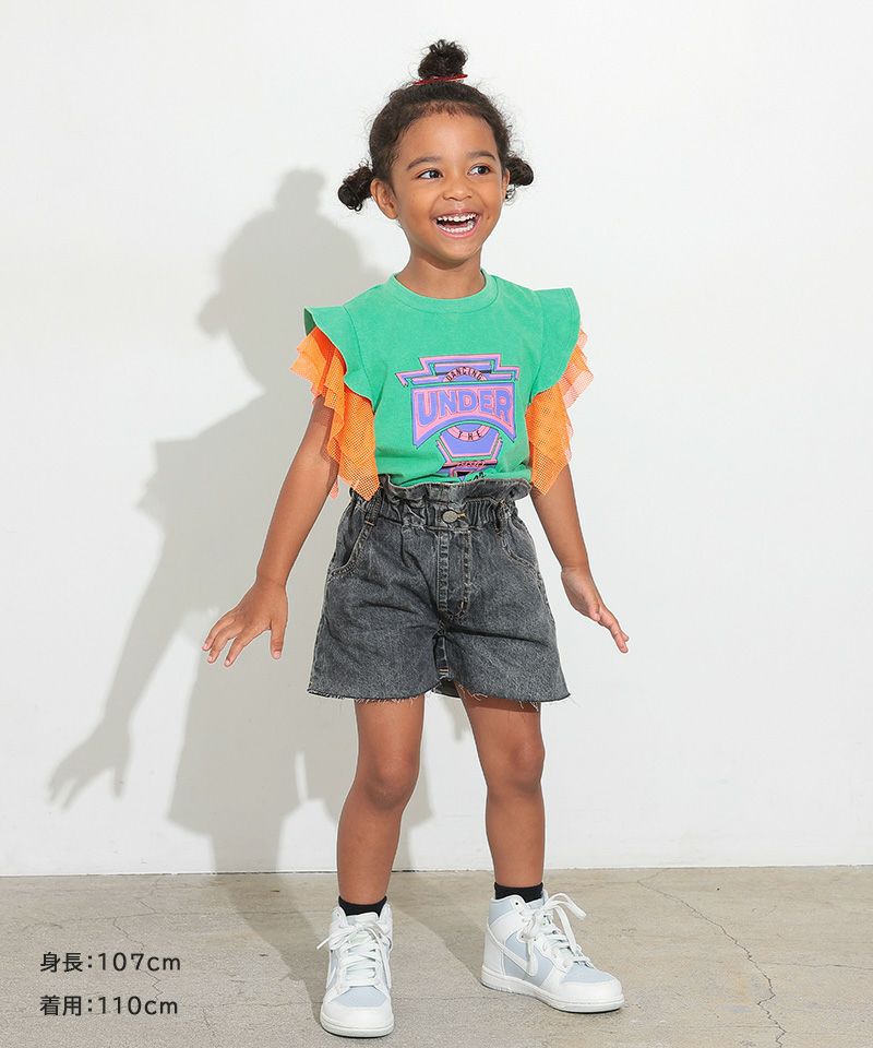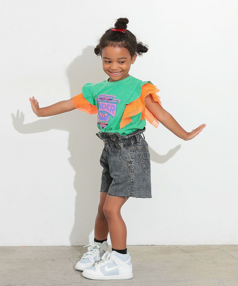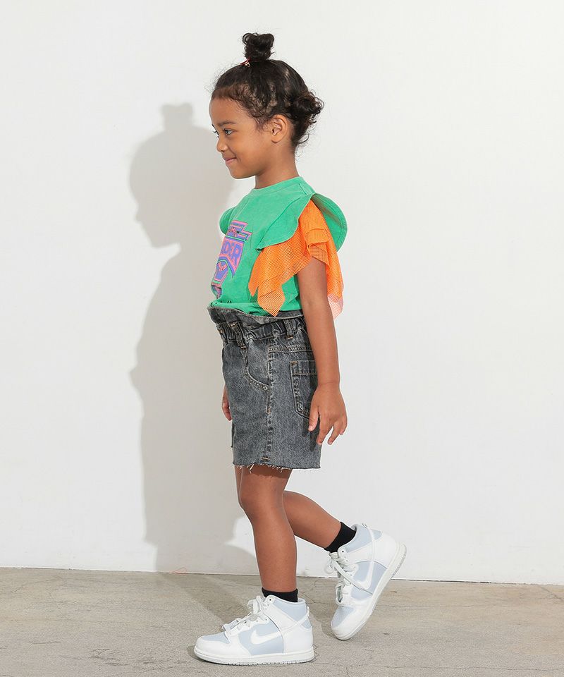 メッシュ素材の袖フリルと’90s風の図案がポイントのTシャツ。