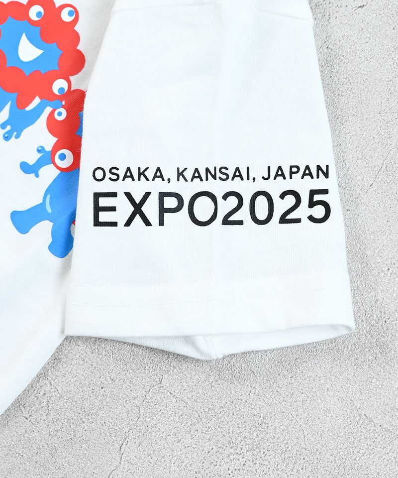 大阪・関西万博公式キャラクター「ミャクミャク」を胸に大きくあしらい、左袖ににロゴをプリントしたTシャツです。